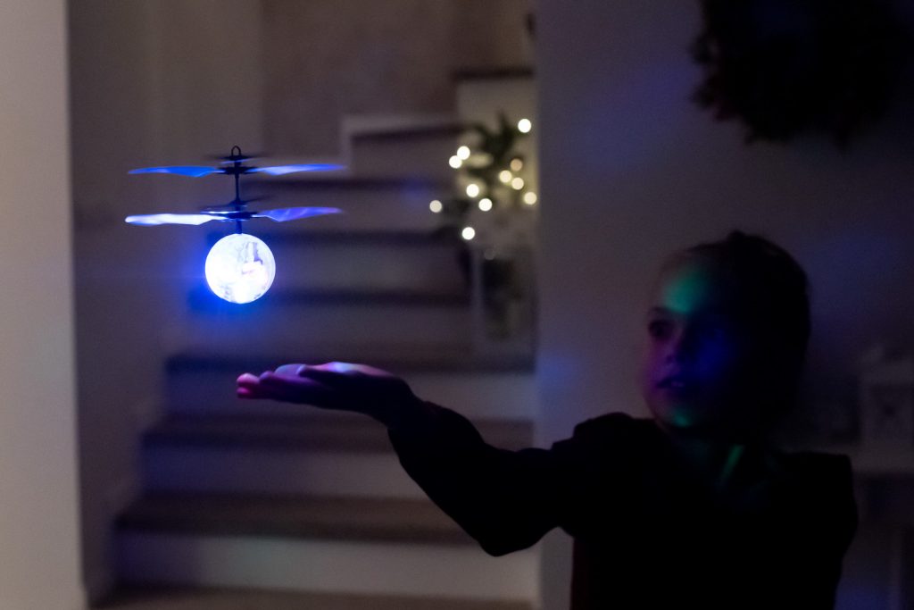 Latająca, świecąca kula – mam problem z nazwaniem tej zabawki. Bo nie jest to dron, ale nie jest też helikopter. To taki trochę mix, który wyglądem przypomina kulę dyskotekową. Tyle że ze śmigłami. Wystarczy naładować i lata. A jak podkładasz rękę, to zaczyna uciekać wyżej. Wygląda efektownie i moim zdaniem to bardzo fajny, oryginalny gadżet.