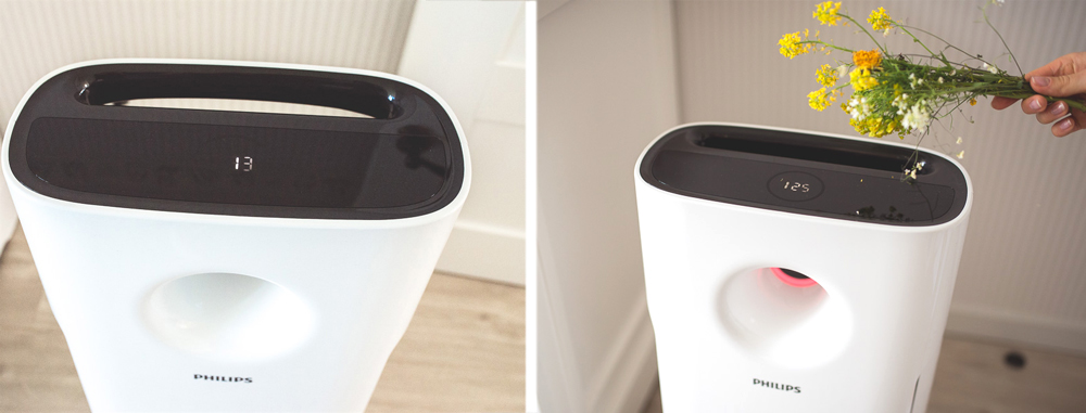 Żeby sprawdzić, czy ten system rzeczywiście działa, wspięłam się na wyżyny swojej kreatywności i przeprowadziłam mały test. Włożyłam trochę energii, żeby za pomocą polnych kwiatów dostarczyć oczyszczaczowi tyle pyłków ile zapragnie… i urządzenie mnie nie zawiodło, bo zareagowało błyskawicznie na zmieniające się warunki. Wskaźnik natychmiast zapalił czerwoną diodę, wyświetlacz pokazał wzrost wartości PM2,5 i włączył się wentylator.