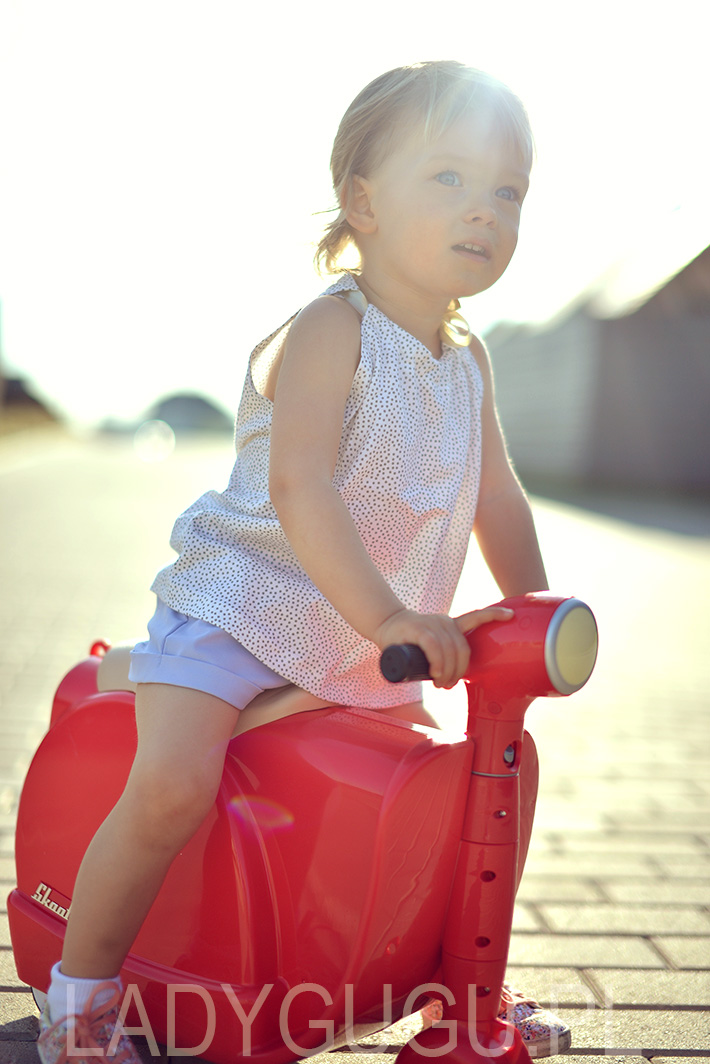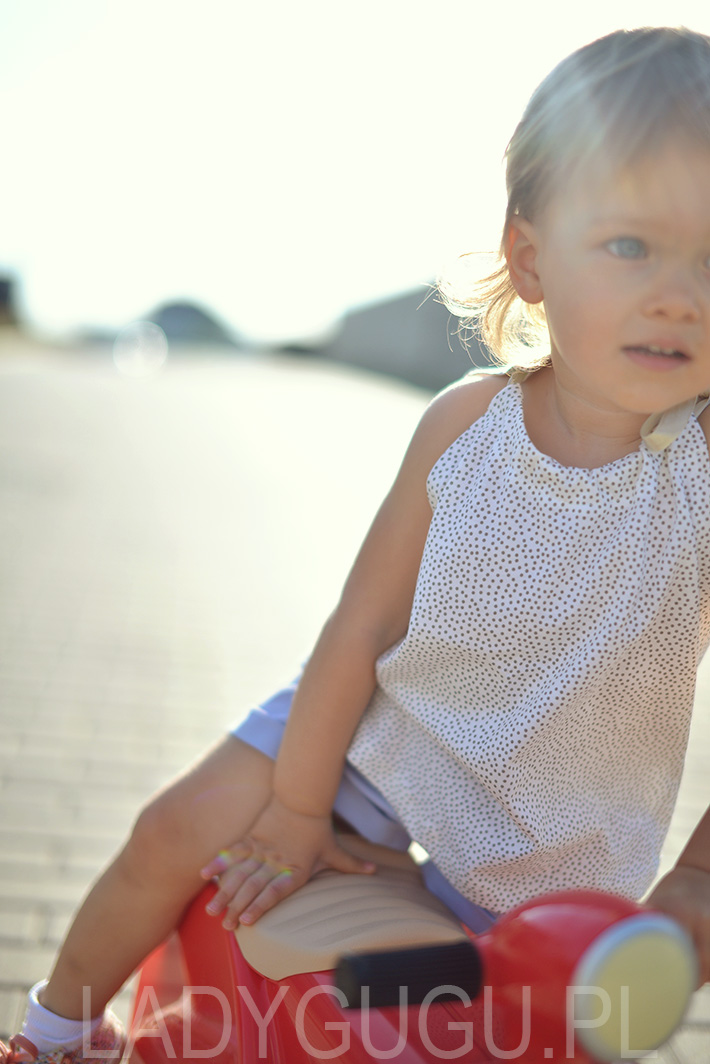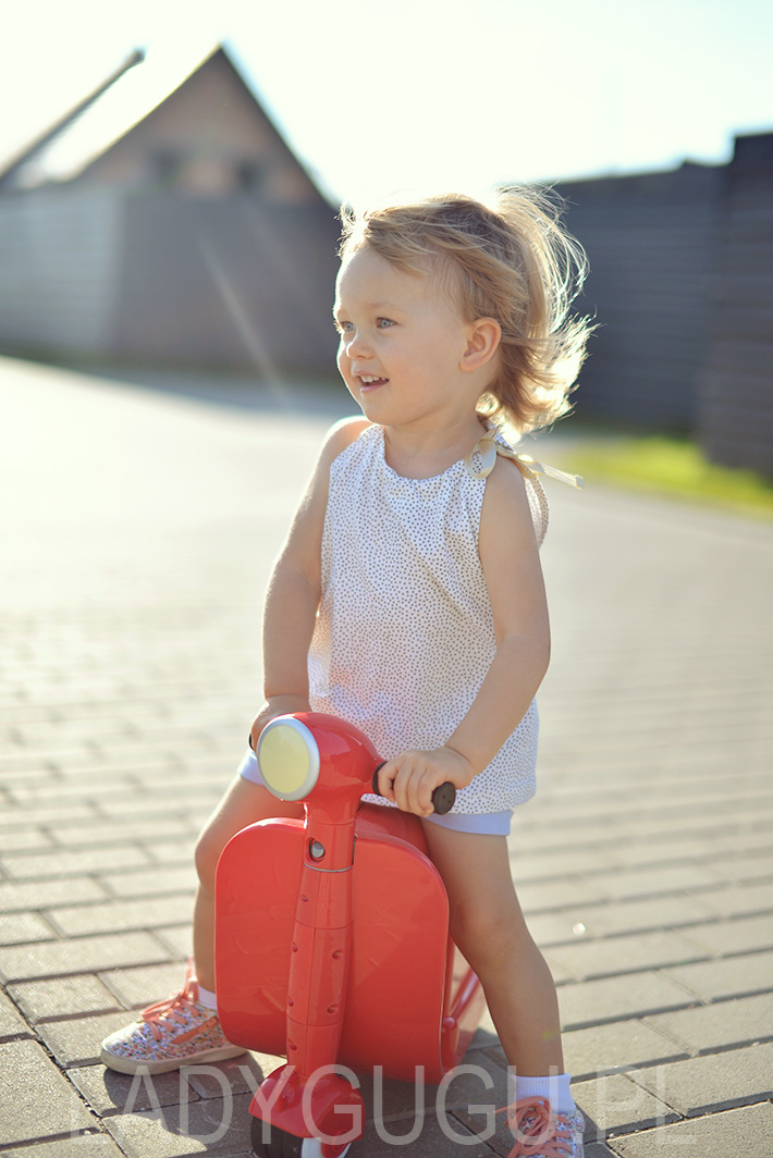 Przyznaję, że kiedy zamawiałam dla Lenki ten czerwony skuter retro, nie miałam pojęcia, że w środku zabawki będzie na mnie czekać niespodzianka. Sprzedawca oczywiście dokładnie opisał produkt, ale kto by czytał opis? Nie ma też sensu oglądanie wszystkich zdjęć. Klikam na pierwszą fotkę, przyglądam jej się przez całe dwie sekundy i wrzucam skuter do koszyka. Po odebraniu paczki od kuriera, wyjmuję zabawkę i ….. siadam ze zdziwienia. Walizka? Uśmiecham się pod nosem i wołam Lenkę. Ta wskakuje na nowy pojazd i zaczyna się szaleństwo. Uznaję więc, że dodatkowa funkcja zabawki to gratis, który z pewnością wiele razy wykorzystamy.