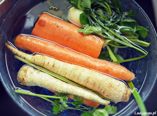 Duużo warzyw i przyprawy:) ( marchewka, pietruszka, cebula, seler, natka pietruszki, por, trochę czosnku, ) i przyprawy ( liść laurowy, ziele angielskie, lubczyk, sól, pieprz). Do tej zupy nie dodawałam czosnku.
