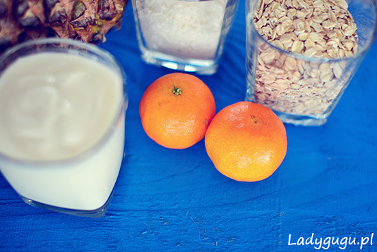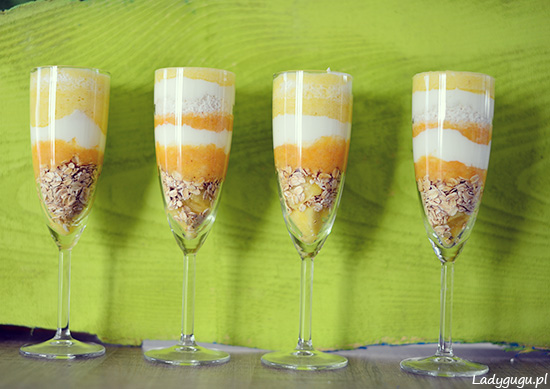 warstwy deseru wkładamy do szklanki lub kieliszka ( mus ananasowy, płatki owsiane, jogurt naturalny, mus bananowo-mandarynkowy, wiórki kokosowe itd).