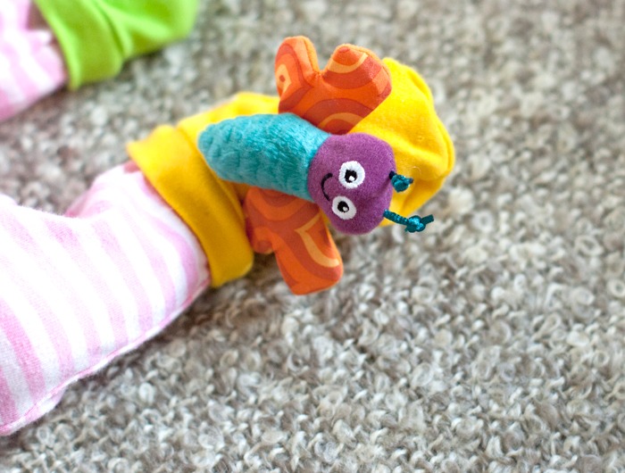 A to zabawka, którą Lenka dostała od Madzika . Ładna ale nie do końca dostosowana do wieku ( dla dzieci od 6 M). To jednak nie dziwi bo ciocia Madzia jeszcze kilka miesięcy temu myślała, że niedrapki ubieramy dziecku na stopy:)