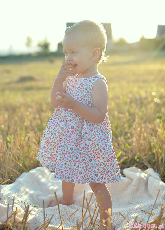 Patrzę na Lenkę biegającą w pięknych sukienkach i śmieję się sama do siebie, przypominając sobie jak bardzo nie lubiłam sukienek kiedy byłam mała. Jak korzystając z chwili nieuwagi mamy, której podstępem udało się na mnie wcisnąć sukienkę, szybko rozbierałam się do golasa, bo przecież wstyd w sukience paradować ( i nie ważne czy byłyśmy w domu czy kupowałyśmy gazetę w kiosku). No cóż, teraz trochę chętniej ubieram sukienki więc i w szafie Lenki wisi ich spora kolekcja. Kwiatki, paski, kropki… na lato super.