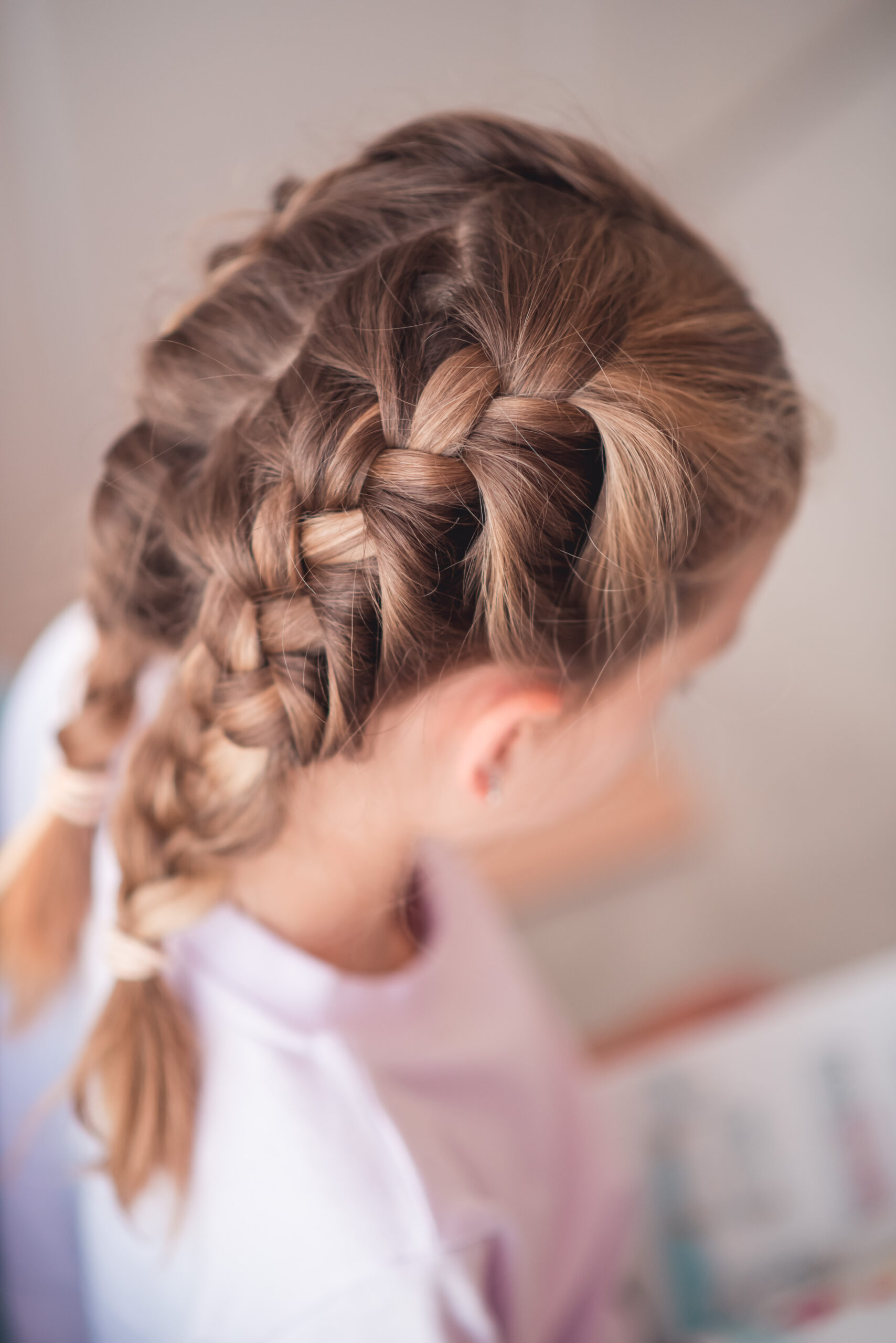 Tak wyglądały próby, ale już efekt, jaki udało się uzyskać po kilku razach prezentował się znacznie lepiej. Warkocz jak warkocz, dobieramy jak do tradycyjnego francuza, tyle tylko, że robimy dwa, po obu stronach głowy. Sztuką jest (jak widać wyżej) równy przedziałek.