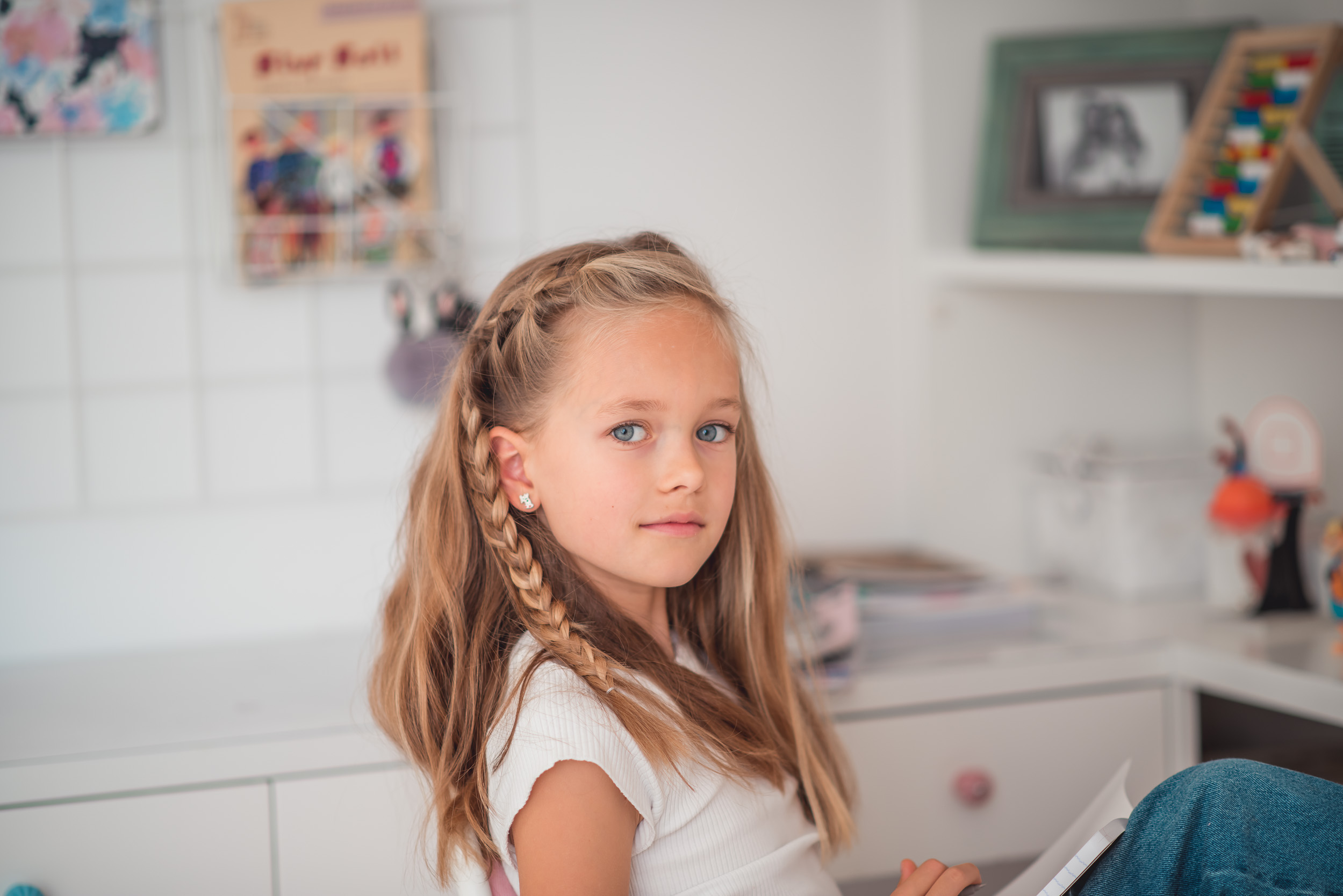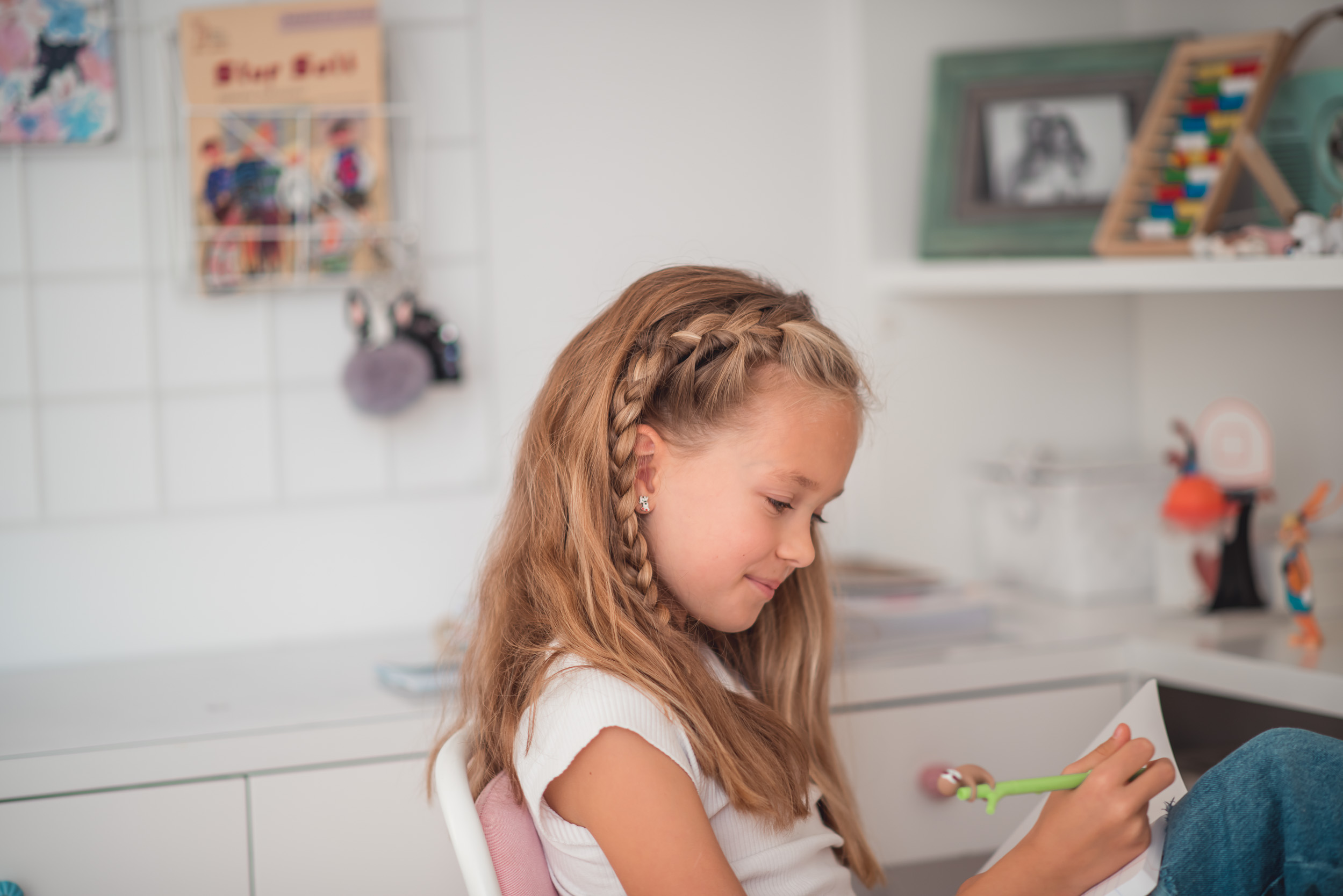 Ostatnia fryzura, to ulubione uczesanie Lenki. Włosy rozpuszczone, ale jednak ujarzmione warkoczem przy grzywce, żeby nie przeszkadzały podczas nauki.