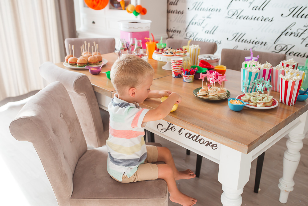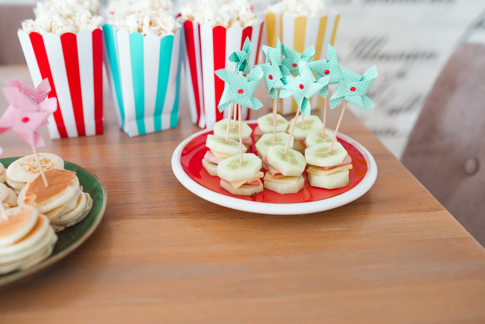 Oczywiście z naszej niezawodnej maszyny, którą Wam kiedyś polecałam: KLIK. Chyba nie znam dziecka, które by nie lubiło tego amerykańskiego przysmaku. Popcorn to niemal zawsze dobry pomysł, bo teraz mnóstwo dzieci ma na coś uczulenie i ciężko trafić z czymś, co mogą zjeść wszyscy bez późniejszej wizyty na pogotowiu. A popcorn jest właśnie taką uniwersalną przekąską. Część porcji robimy z roztopionym masełkiem, a część bez. Ładujemy do małych kolorowych papierowych pudełeczek i każde dziecko może mieć swój kolor.