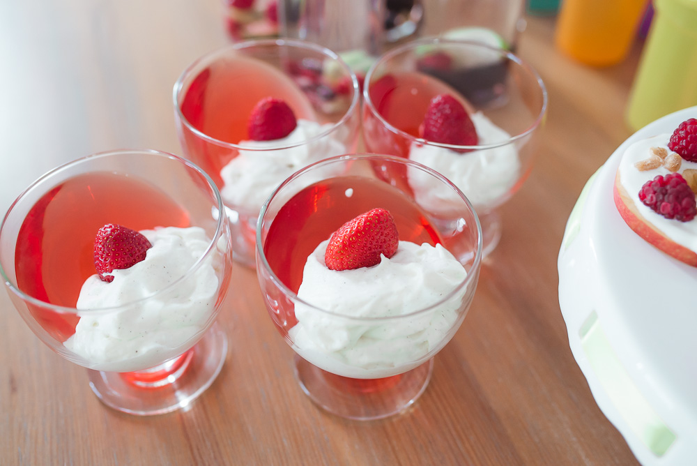 Obiecuję, że to ostatnia słodka rzecz, jaką Wam proponuję. No ale które dziecko nie lubi galaretek? Można je przygotować w pucharkach, szklaneczkach, szklanych półmiskach. Można po wlaniu płynu przechylić naczynia pod kątem, wtedy uzyskamy super efekt ukośnego ułożenia galaretki. Dekorujemy bitą śmietaną i posypką lub owocami.