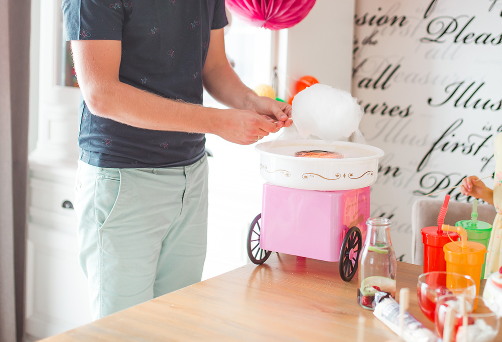 To niekwestionowana królowa wszystkich dziecięcych imprez. Nie bez powodu na wielu jarmarkach czy odpustach stoi zawsze pan z wózkiem, przy którym kręci watę dla dzieciaków. My już jakiś czas temu poszliśmy o krok dalej i zamiast zamawiać do domu taką usługę, sami zainwestowaliśmy w sprzęt a swojego pana mamy w postaci mojego męża. Na małych gościach wrażenie robi nie tyle sama wata, co możliwość zrobienia jej samodzielnie i to w takim fajnym stylowym urządzeniu, które już samo w sobie może robić za zabawkę i jest wspaniałą dekoracją np. imprezowego stołu. Wystarczy wsypać łyżeczkę cukru, ewentualnie dodać barwnik spożywczy i cukrowa bomba kaloryczna gotowa. 4