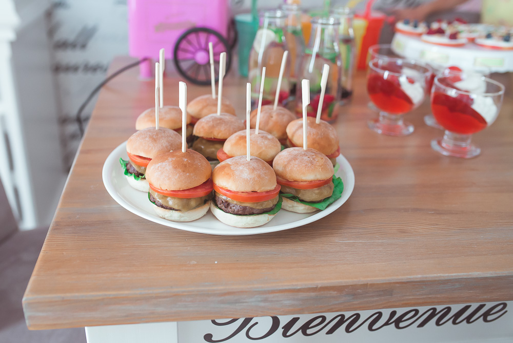 Czyli taka mini wersja zwykłych burgerów. W tym przypadku skorzystałam z pomocy naszej zaprzyjażnionej restauracji. Zamówiłam miniaturowe wersje burgerów, które najbardziej nam smakują. Ale takie burgery można zrobić samemu w domu. Warto kupić już gotowe miniaturowe bułeczki lub jeśli mamy czas, możemy je upiec samemu przed imprezą. Jednak, żeby wyglądały ładnie i profesjonalnie, to radzę wybrać pierwszą wersję. Mamy pewność, że wszystkie bułeczki są symetryczne i w podobnym rozmiarze. Do środka pakujemy mięsko, ser żółty, pomidora w plasterkach i sałatę. No śliczności!