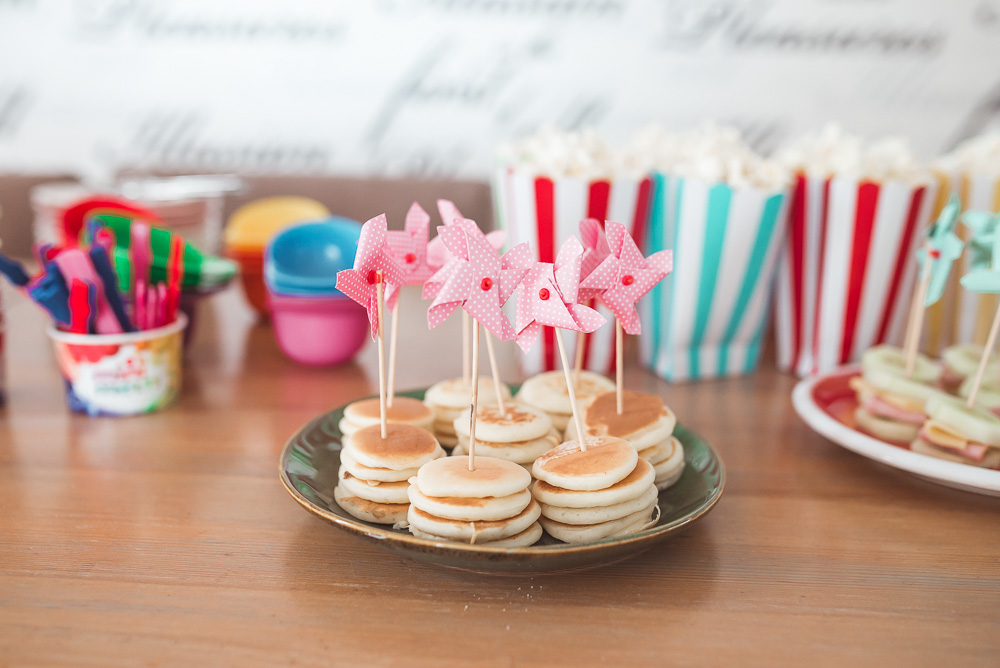 Robimy jak zwykłe pankejki, tylko że na patelni odmierzamy naprawdę małe okrągłe porcje, w miarę starając się, żeby wyszły w podobnym rozmiarze. Gotowe pankejki możemy ułożyć jeden na drugim i na górze dodać owoc, np. malinę, jeżynę itp. i to wszystko przebić od góry zwykłą lub ozdobną wykałaczką. Możemy też u dołu i na górze dać naleśniczek i do środka owoc. Jak kto woli.