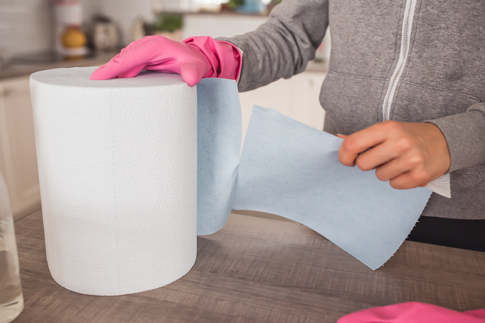 Ręcznik papierowy: używam ręczników papierowych codziennie i nie wyobrażam sobie bez nich funkcjonowania, serio! Korzystam z nich kiedy coś się rozsypie lub rozleje, w kuchni, łazience, salonie i w każdym zakamarku domu. Rolka ręcznika papierowego w naszym domu jest zawsze. I jestem zdania, że lepiej zainwestować w dobrej jakości papier, bo mając dzieci i zwierzę używa się go non stop!
