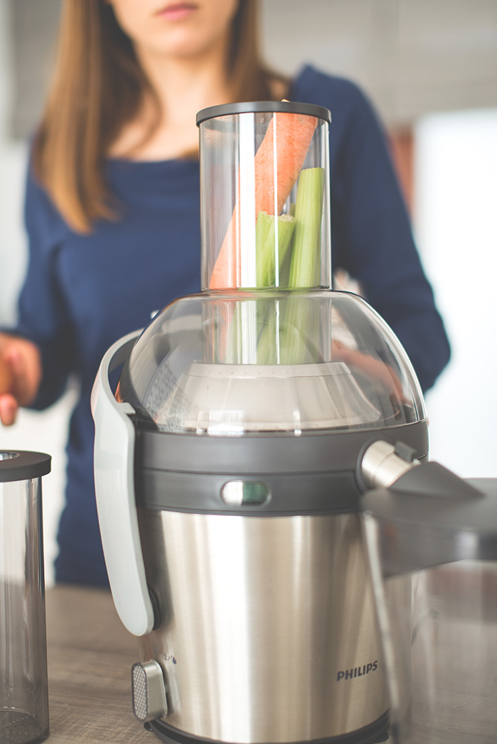 A sokowirówka? Jak wszystkie urządzenia Philips, które mam w domu, w 100 % spełniła moje oczekiwania. Mimo iż nie miałam do tej pory sokowirówki, doskonale wiedziałam czego oczekuję od takiego urządzenia. Zależało mi, żeby po przygotowaniu soku nie marnować zbyt wiele czasu na mycie urządzenia.  Funkcja wstępnego czyszczenia i wysokopolerowane sitko to dwa największe zaskoczenia zafundowane mi przez sokowirówkę Philips. Po przygotowaniu soku myję sitko za pomocą gąbki a pozostałe części wkładam do zmywarki. Podoba mi się też, że producent pomyślał o zaoszczędzeniu mojego czasu nie tylko po przygotowaniu soku, ale też w trakcie.Duży otwór na owoce i warzywa  pozwala wrzucać je w całości, więc problem obierania, krojenia, sprzątania łupin i obierków odpada zupełnie.  Sokowirówka jest mała i estetycznie wykonana, dzięki czemu postawiona na kuchennym blacie, nie zajmuje dużo miejsca a na dodatek jest ozdobą kuchni. Jej użytkowanie jest bajecznie proste, co potwierdzają moi mali pomocnicy.