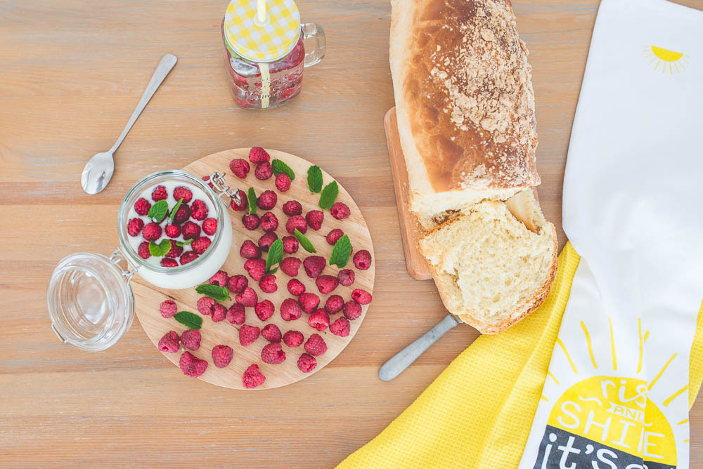 Wyrośniętą drożdżówkę smaruję roztopionym masłem i obficie posypuję kruszonką. Następnie szybko wkładam do piekarnika nagrzanego do 180 st. C na około 40 minut. Obserwuję proces pieczenia przez szybkę i jeśli jest taka potrzeba (a zazwyczaj jest) co jakiś czas zmniejszam temperaturę; najpierw do 170 st C, ostatecznie kończąc pieczenie na 160 st C.  W trakcie pieczenia nie otwieram piekarnika żeby ciasto nie opadło. Drożdżówkę podaję z jogurtem wymieszanym z miodem  i owocami. Pycha!