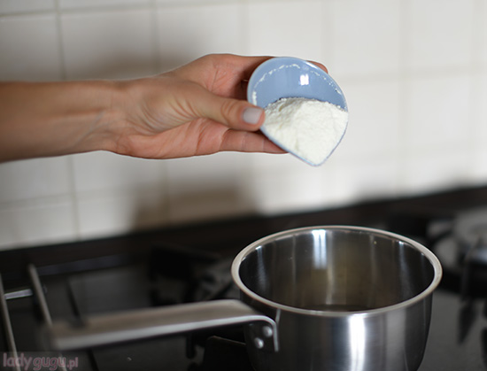mleko w proszku przygotowujemy według przepisu na opakowaniu. 150 ml wlewamy do garnka