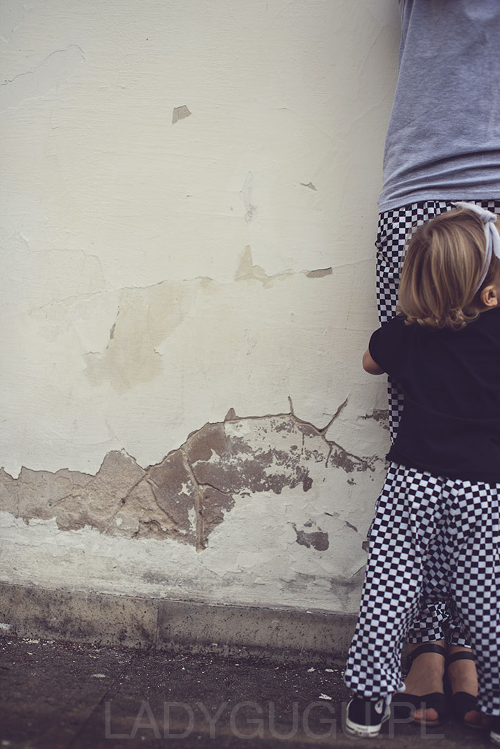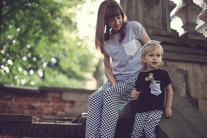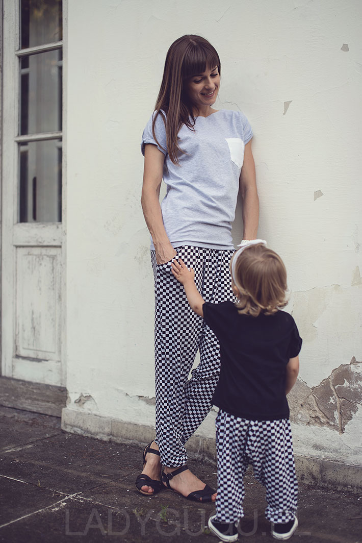 Do tej pory na blogu pojawiły się dwa posty, w których pokazałam Wam moje pomysły na identyczny strój dla mamy i córki. Sukienki w groszki od Agnieszki Lisiewicz i mniej zwariowane sukienki bombki od Katarzyny Sokół, to moje propozycje na te wielkie i trochę mniejsze wyjścia. Dzisiaj mam dla Was pomysł na podobne kreacje dla mamy i córki, jednak tym razem są to ubrania, które możecie nosić na co dzień. Wygodne i praktyczne alladynki w szachownicę i proste koszulki, to moim zdaniem zestaw idealny, który sprawdzi się w każdej sytuacji. Są tak wygodne, że zapominamy, że mamy je na sobie.