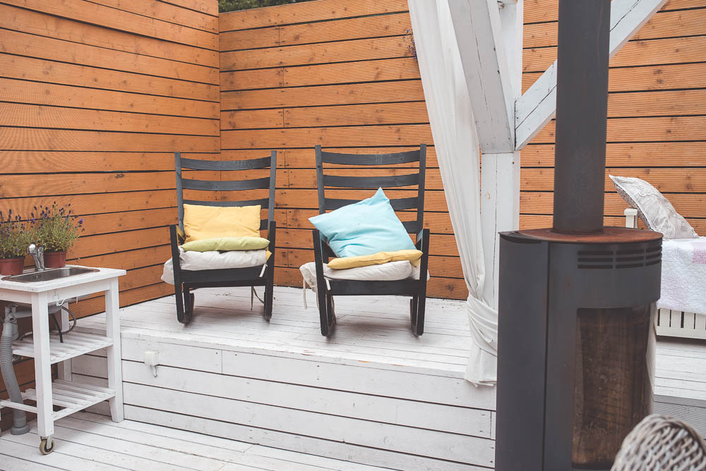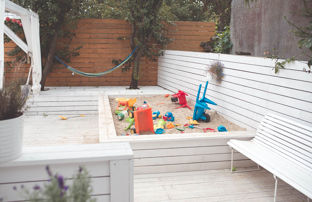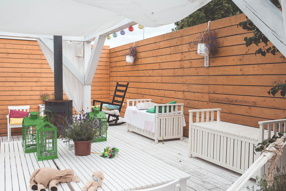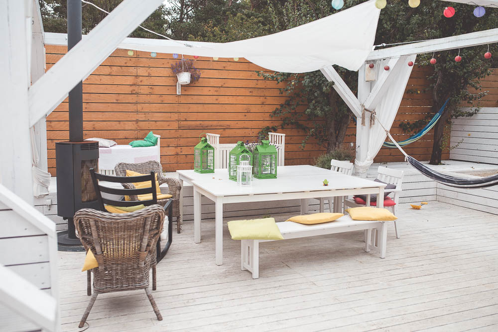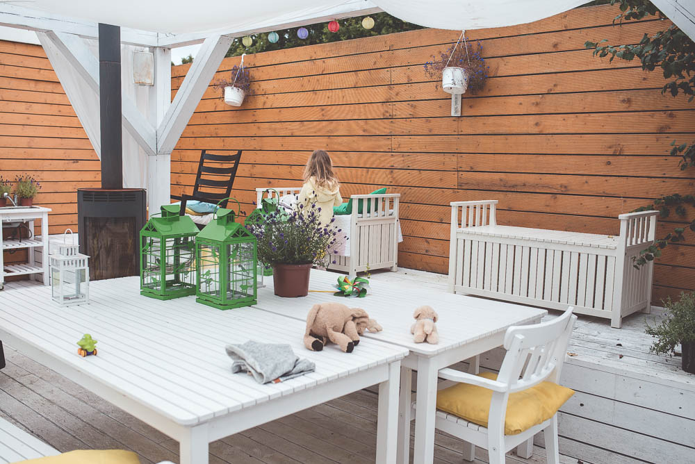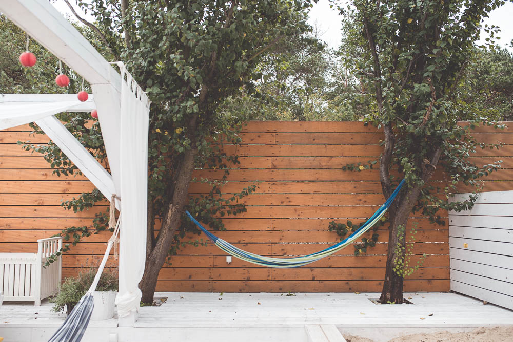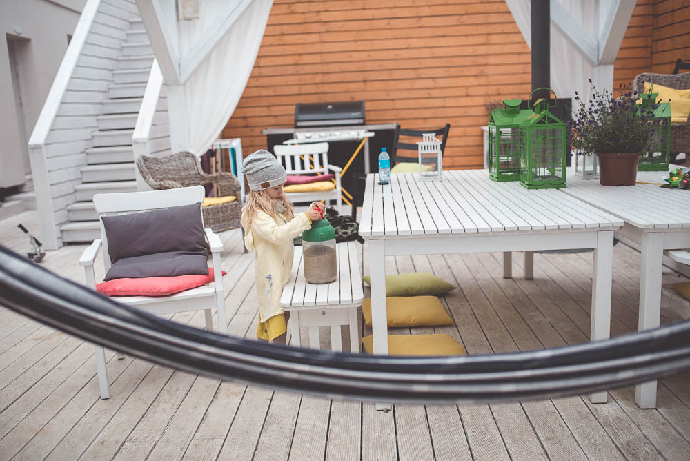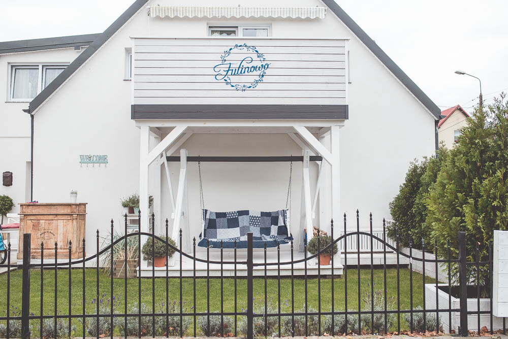 W Fulinowie najpiękniejszy i najbardziej urzekający jest przestronny taras: białe deski, piękny stół, hamaki, leżaki, fotele bujane. Tyle opcji odpoczynku, że aż żal nie skorzystać. Fajnie, że właściciele pomyśleli o dzieciach i dali im zajęcie, a tym samym chwilę wytchnienia rodzicom: jest sporej wielkości piaskownica, hulajnogi, rowery, piłki, gry, a nawet wózki do przewożenia dzieci podczas wycieczek rowerowych (o ścieżkach rowerowych na Helu wspominałam już przy okazji wpisu z naszych lipcowych wakacji).