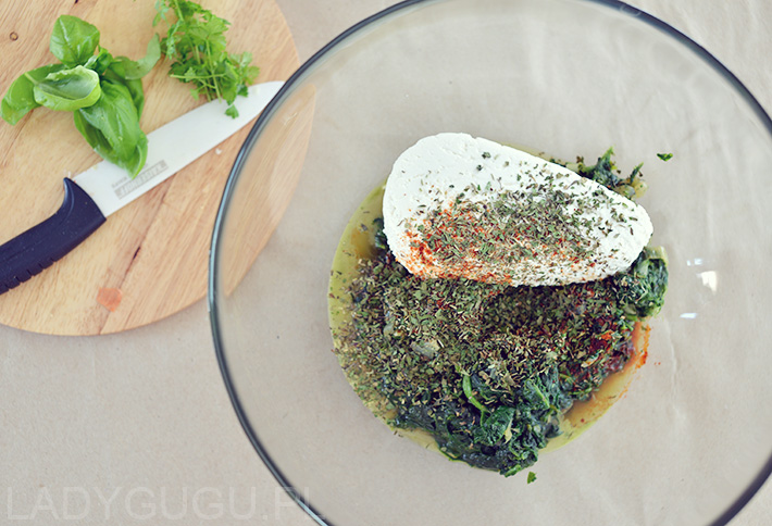 2. Kiedy szpinak lekko ostygnie, wyciskamy z niego wodę. Przekładamy go do miski i mieszamy z twarożkiem i przyprawami.