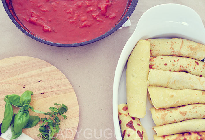 4. W tym czasie farsz zawijamy w naleśniki, które następnie układamy w naczyniu żaroodpornym.