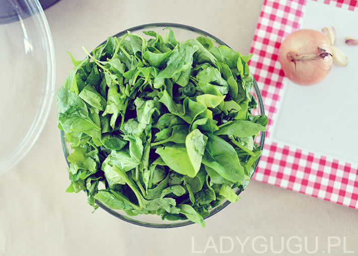 1. Pokrojoną na małe kawałki cebulę, podsmażamy z czosnkiem. Kiedy już lekko się zarumienią, dodajemy szpinak. Wszystko dusimy przez około 10 minut.