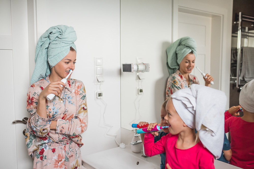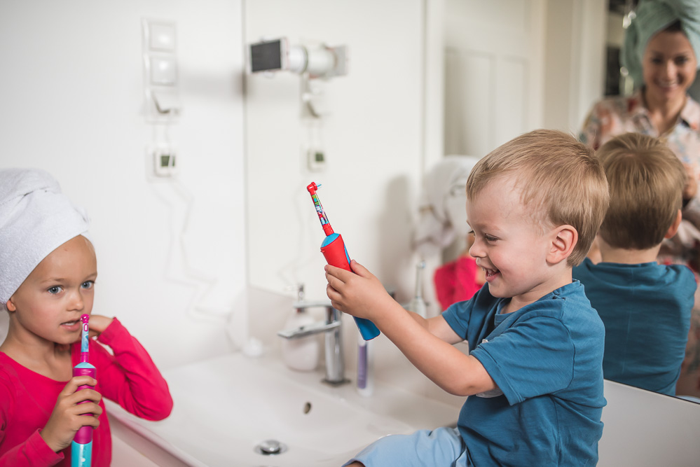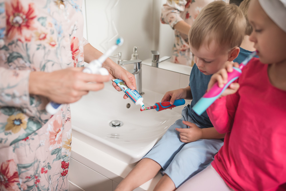 – prawidłowa higiena jamy ustnej – nie wstydzę się tego, że – choć nasz rytuał mycia zębów przypominał długo drogę przez mękę – nasze dzieci po prostu muszą wyczyścić dokładnie zęby. Co wiąże się z tym, że nie tylko nakłaniamy je do samodzielnego szczotkowania, ale po tym przejmujemy szczoteczkę i nanosimy… hmm… poprawki, żeby mieć pewność, że wszystkie ząbki (i język) zostały wyczyszczone jak trzeba.