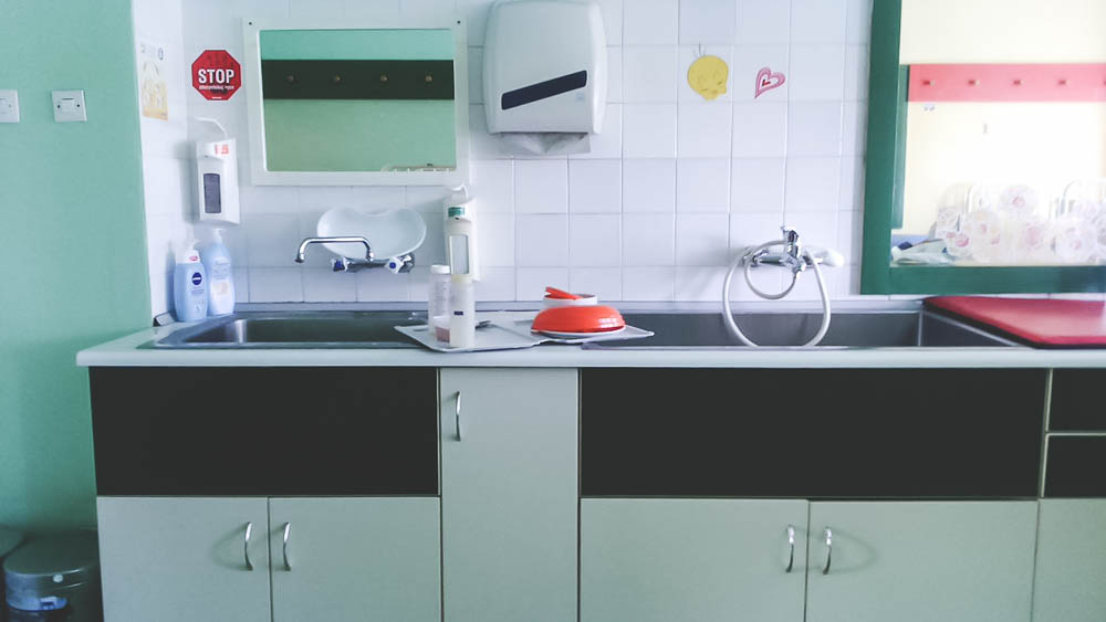 Sala, wielkością na max 3-4 łóżeczka, mieściła ich 6 + mama śpiąca pod lozeczkiem. Jedna łazienka, właściwie zerowe zaplecze kuchenne – sama nie wiem jak podolalam 🙂