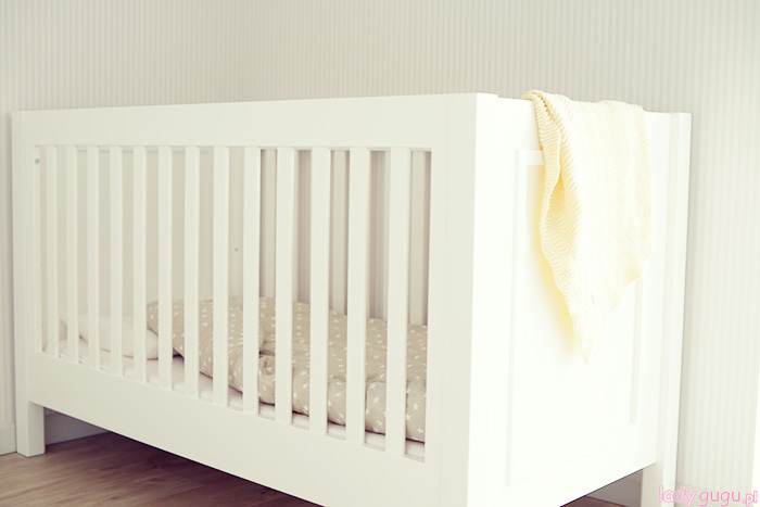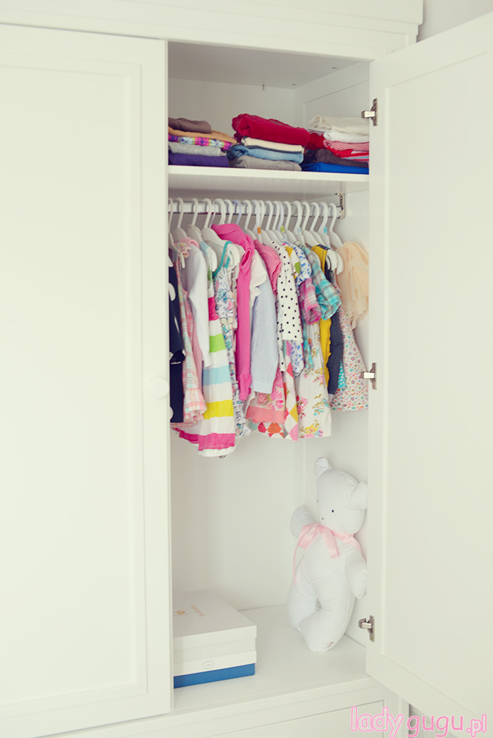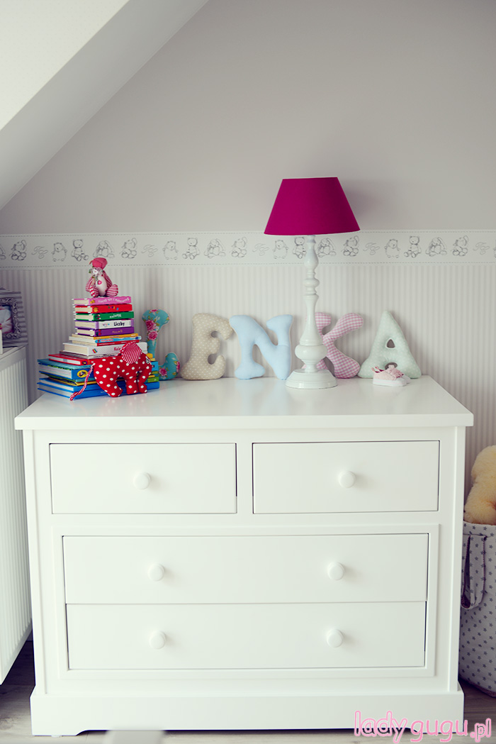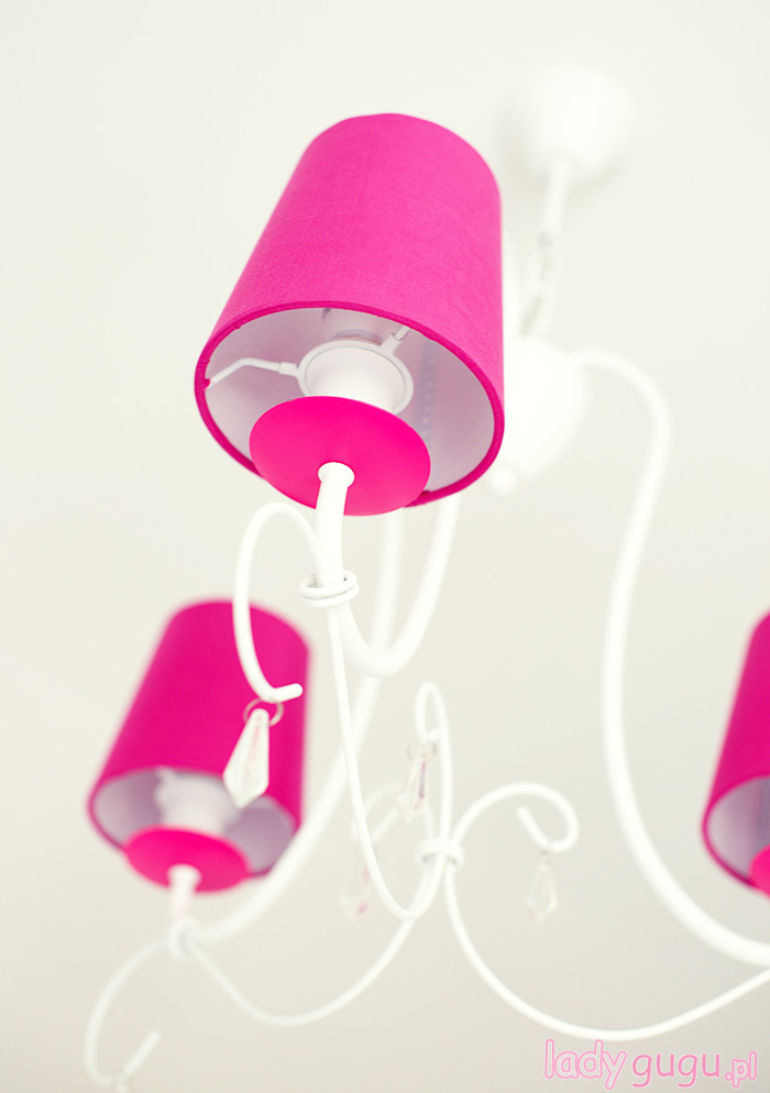 Dom urządziliśmy w stylu, który sama nazywam skandynawski light. Czyli dużo bieli i szarości  z odrobiną szaleństwa w  kilku pomieszczeniach. Pokój Lenki to pierwsze pomieszczenie, które udało nam się urządzić. Zależało nam żeby od pierwszego dnia w nowym domu miała swoje miejsce. Przeważają jasne kolory z kilkoma mocnymi akcentami w postaci skrzynki na zabawki, żyrandola i lampki nocnej, które zwracają na siebie uwagę mocnym kolorem fuksji. Oczywiście nie mogło też zabraknąć huśtawki. Lenka uwielbia się na niej huśtać przed snem…