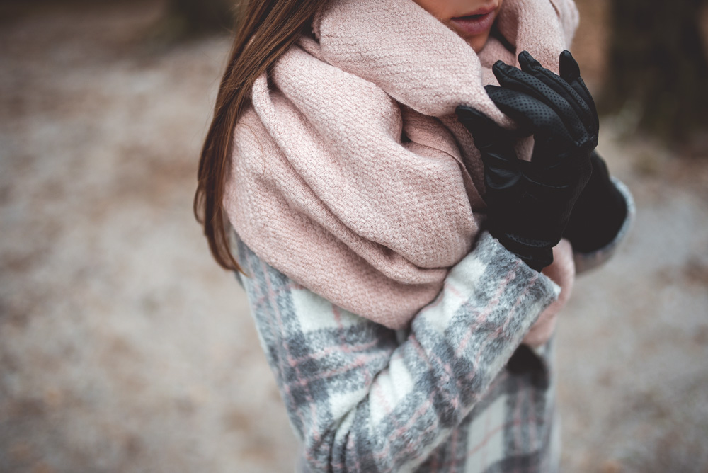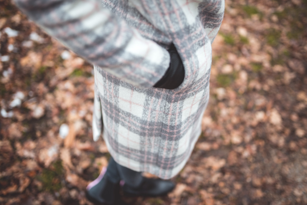 szary płaszcz, szal w bordowo-białą kratę…..brakuje tylko butów 🙂
