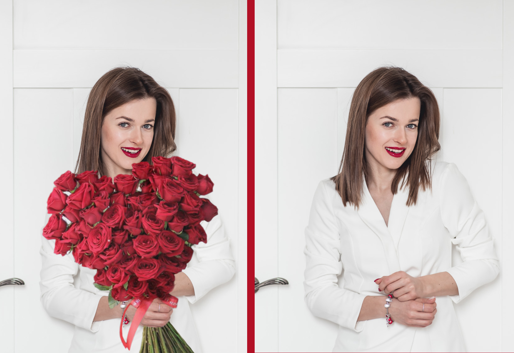 I wtedy moim oczom ukazuje się zdjęcie. Moje zdjęcie, na którym trzymam ogromny bukiet czerwonych róż, wklejonych do zdjęcia przez mojego genialnego męża w Photoshopie.