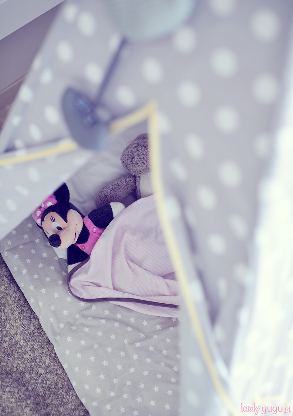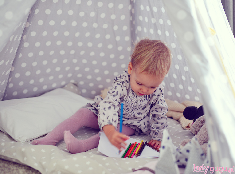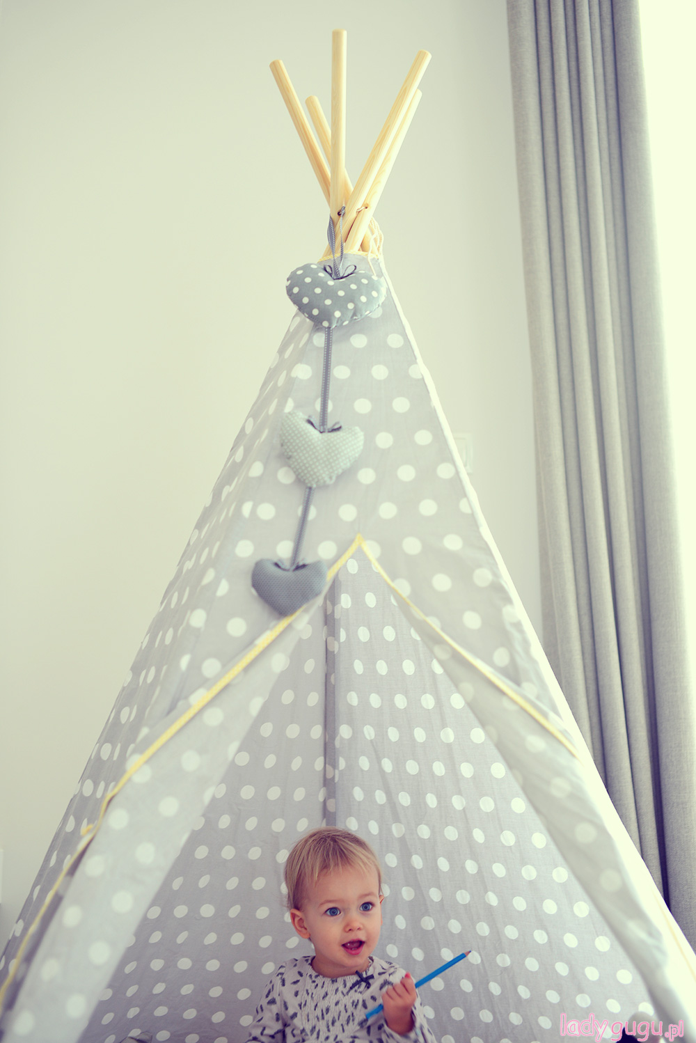Podobno każda księżniczka musi mieć swój zamek. Jest więc zamek.  Tipi w grochy szybko skradł moje serce… ani się spostrzegłam jak Lenka spod stołu w jadalni, nakrytego kocami ( gdzie do tej pory był jej domek), przeniosła się do nowego, przytulniejszego lokum.