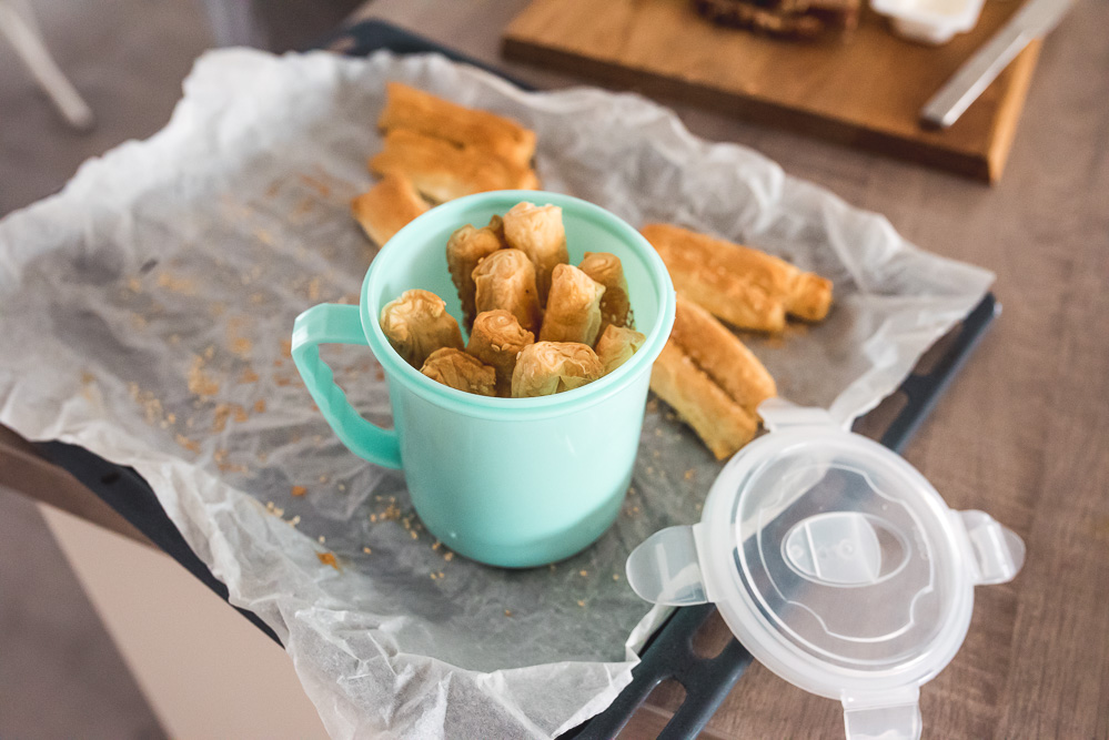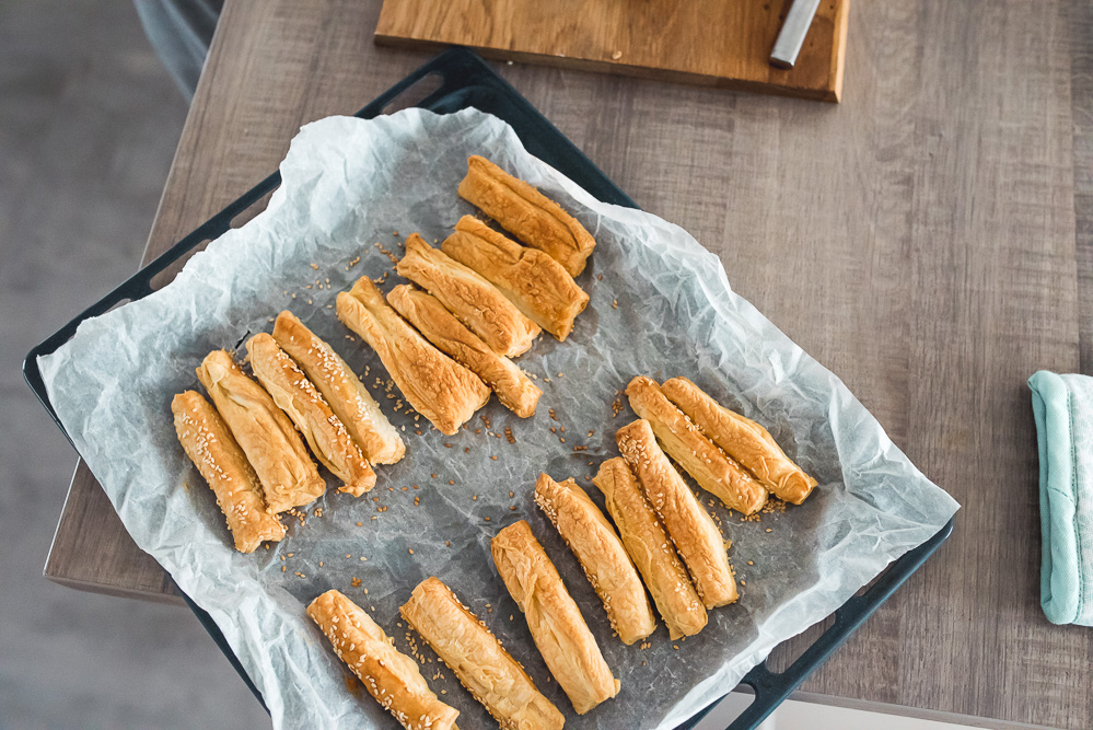 Paluchy z ciasta francuskiego: na początek mam dla Was protip: pamiętajcie, żeby nie były za długie. Łamią się w samochodzie i nic dobrego z tego nie wychodzi. Gotowe ciasto francuskie tnę na cienkie paski, posypuję serem (tutaj jak kto woli, można użyć też sezamu, czarnuszki albo maku). Wystarczy przyklepać, ciasta skręcić w spiralkę i włożyć do piekarnika rozgrzanego do 180 stopni. Ok. 10 minut później przekąska gotowa.