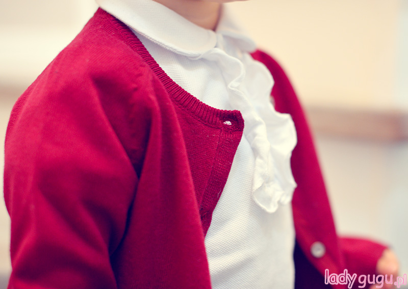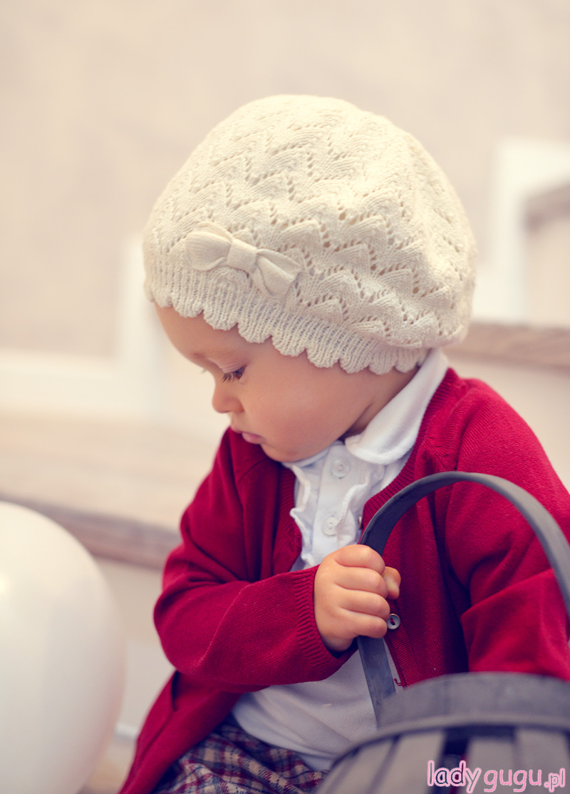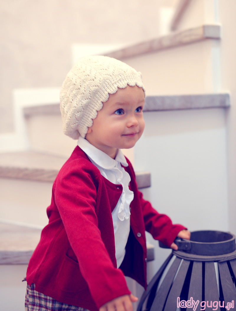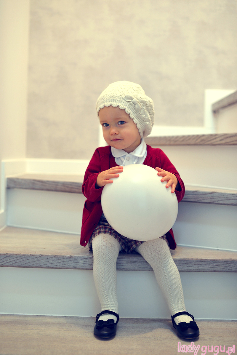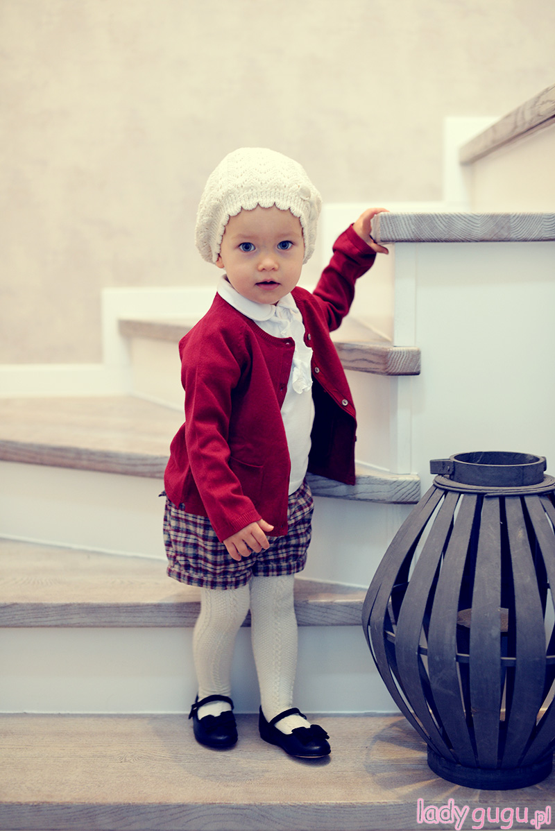 Lubię Lenkę w wydaniu odrobinę poważniejszym, lubię też mieć w jej  szafie ubrania, które są  na tyle uniwersalne, że kiedy trzeba, posłużą jako baza do każdego stroju.  W tym przypadku, tą właśnie bazą jest biała bluzka z żabotem, którą kupiłam w Bellbino.pl.  Nie wiem czy to dobra jakość materiału, czy cud, ale wszystkie plamy, jakie na bluzce zrobiła do tej pory Lenka, zeszły bez większych problemów, więc bluzka służy nam już dość długo.  Do tego zestawu, wykorzystałam też czapkę i rajstopy, które są Wam już znane , bo pierwszy raz pokazałam je prawie rok temu (w tym poście) . Spodenki, Lenka ma na sobie pierwszy i pewnie ostatni raz, temperatura spada więc kolejne wyjście w takim stroju niestety dopiero wiosną.