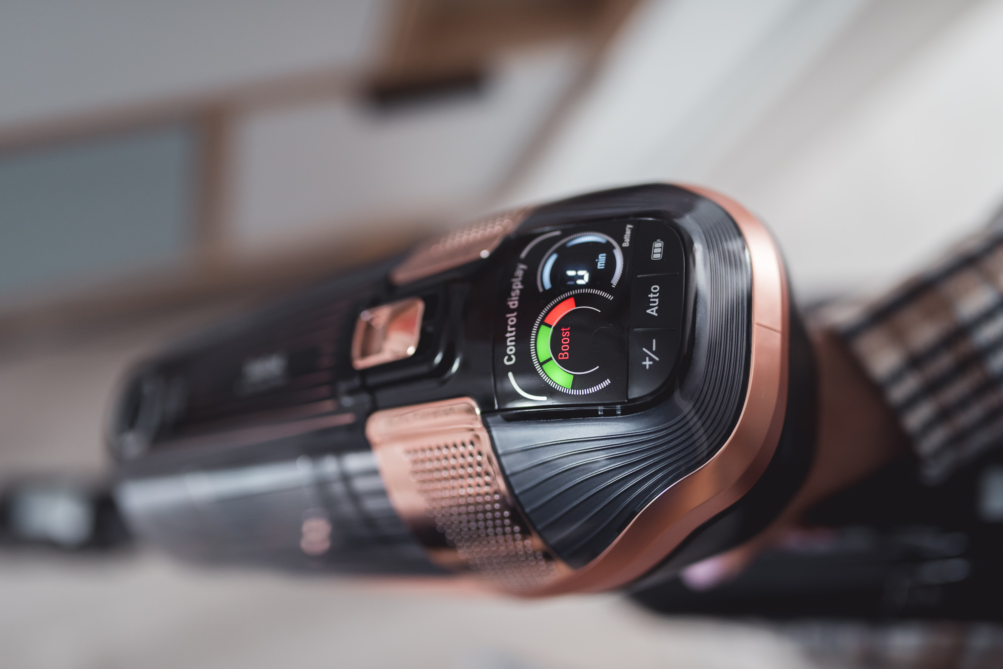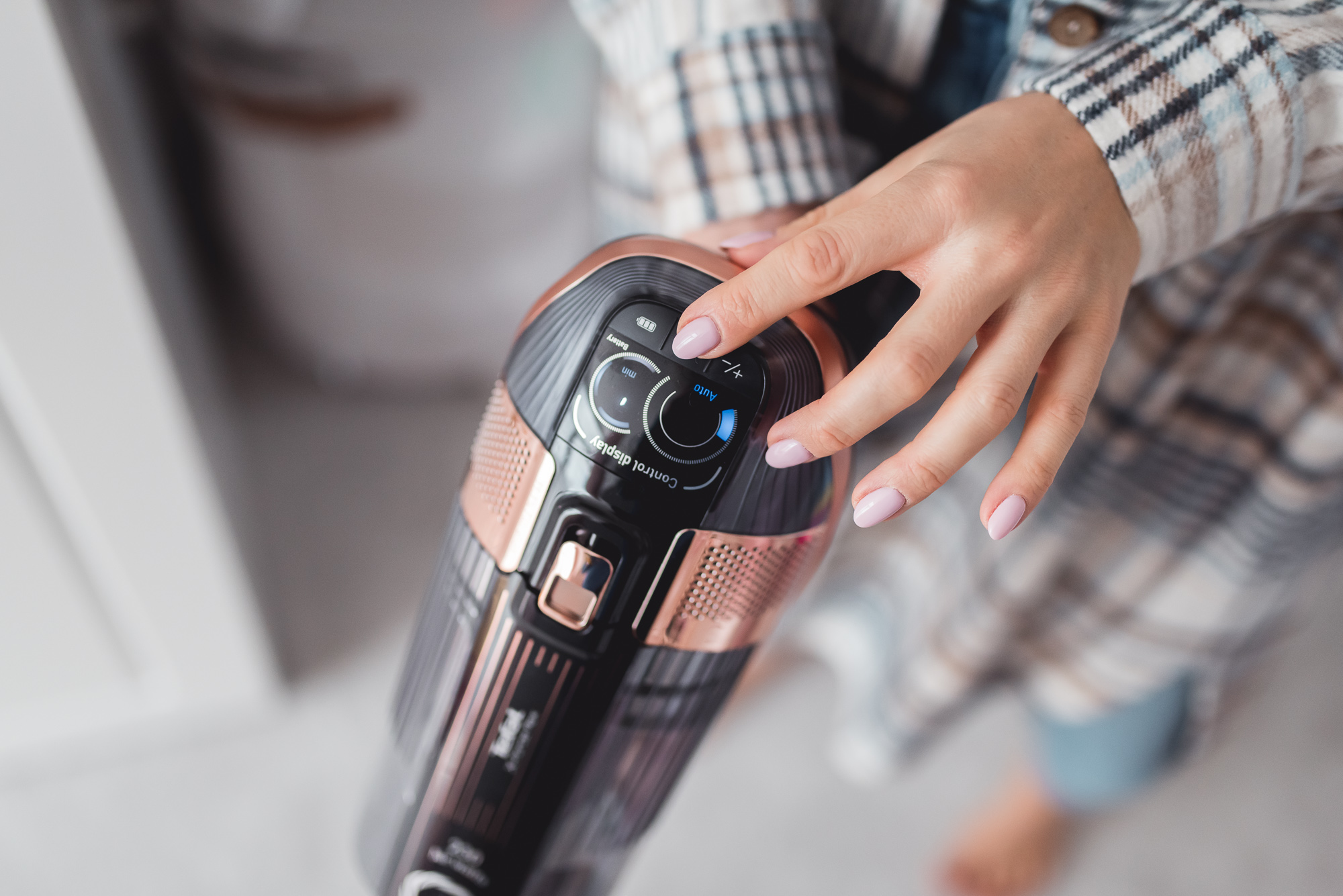 Oczywiście bateria zużywa się najszybciej, kiedy odkurzam wykładzinę w pokoju Lenki. Ale nie ma tego złego… – odkurzacz wyposażony jest w tryb Auto. W skrócie: rozpoznaje odkurzaną powierzchnię i dostosowuje do niej moc ssącą. To bardzo wygodne i ekonomiczne rozwiązanie. Nawet jeśli sprzęt zużyje trochę więcej mocy podczas odkurzania wykładziny, w kuchni trochę jej zaoszczędzi. Balans zostanie zachowany.