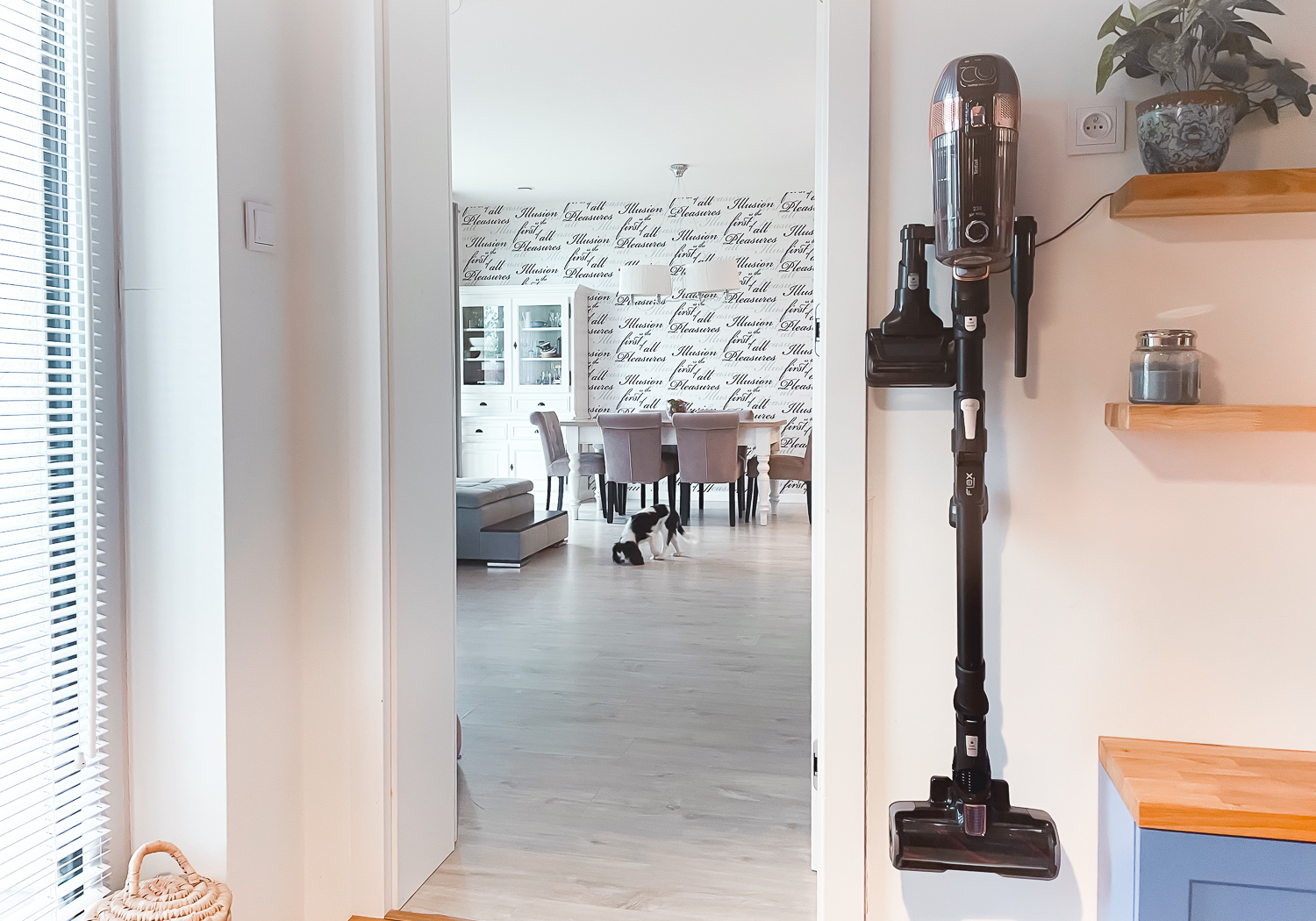 Odkurzacz co prawda zmieniliśmy, ale strategia pozostała ta sama – nasz nowy nabytek postawiłam w takim miejscu, żeby zawsze znajdował się pod ręką. Łatwiej zmobilizować się do sprzątania, gdy odkurzacz stoi np. w salonie za zasłoną, a nie gdzieś na strychu lub pod schodami. I właśnie to uważam za jedną z największych zalet pionowych odkurzaczy – można je trzymać w dowolnym miejscu, na wolnostojącej stacji dokującej, czy tak jak nasz- powieszony na ścianie w pralni, bo zajmują niewiele miejsca.
