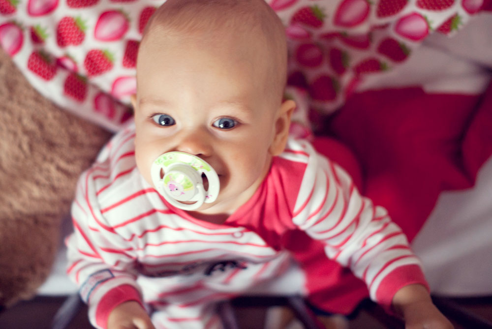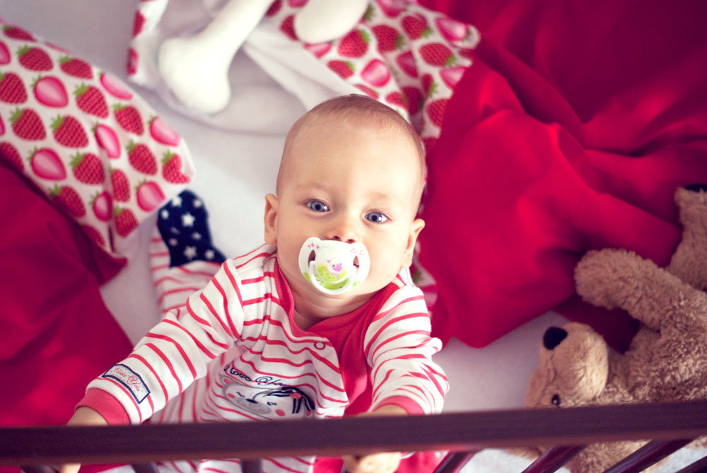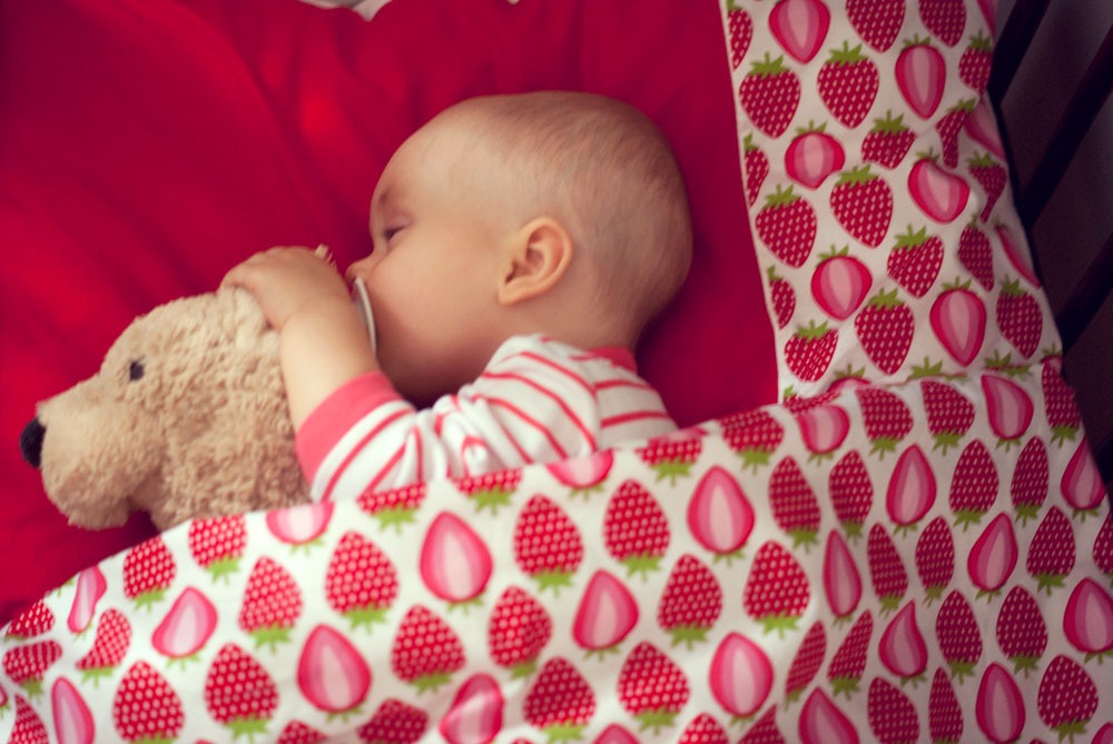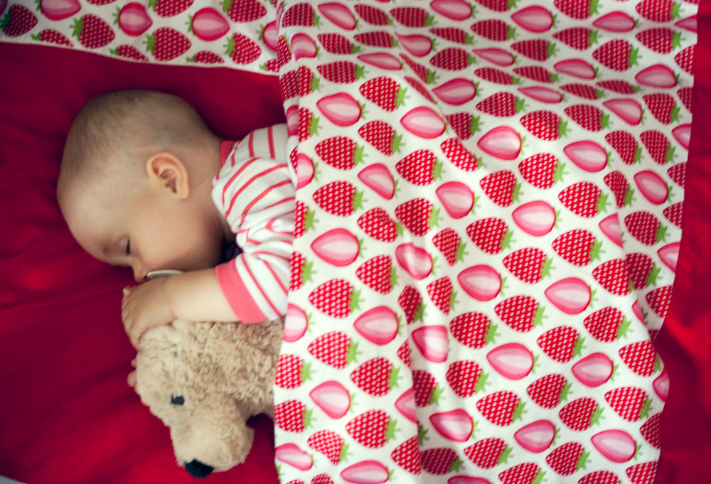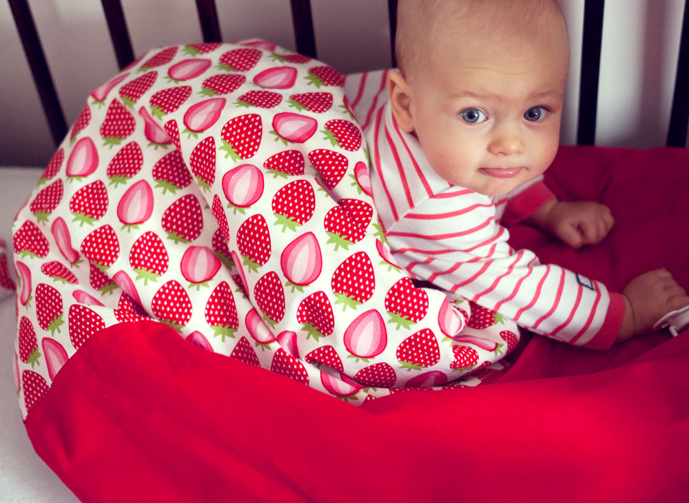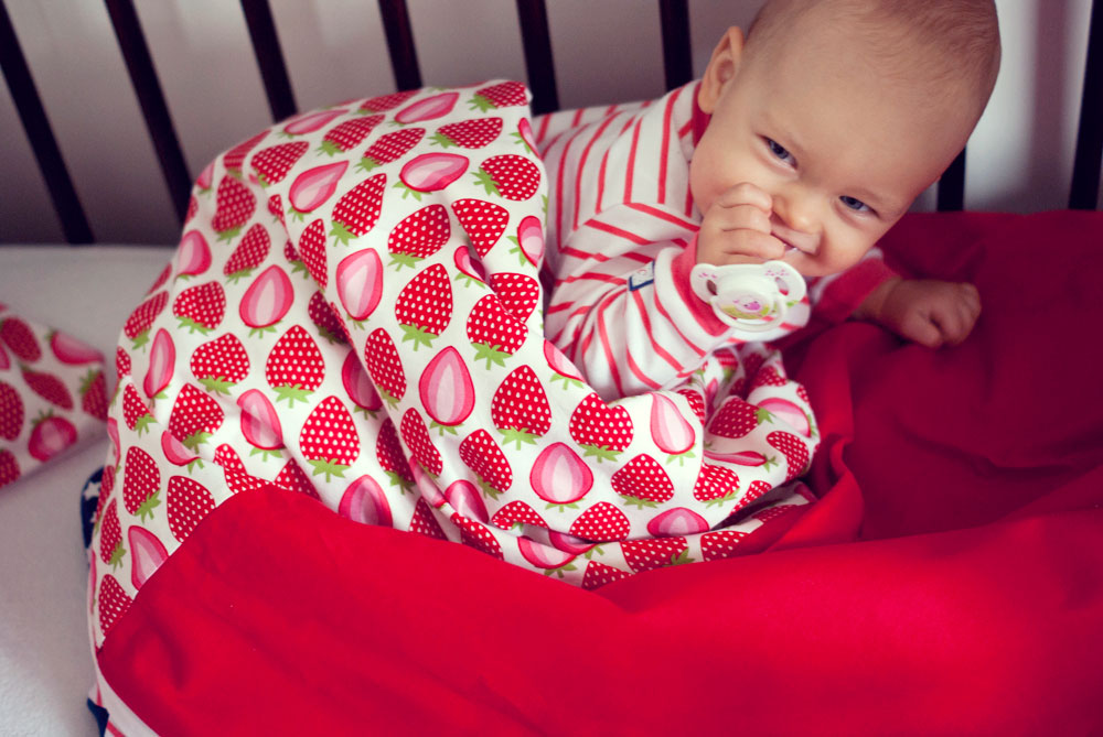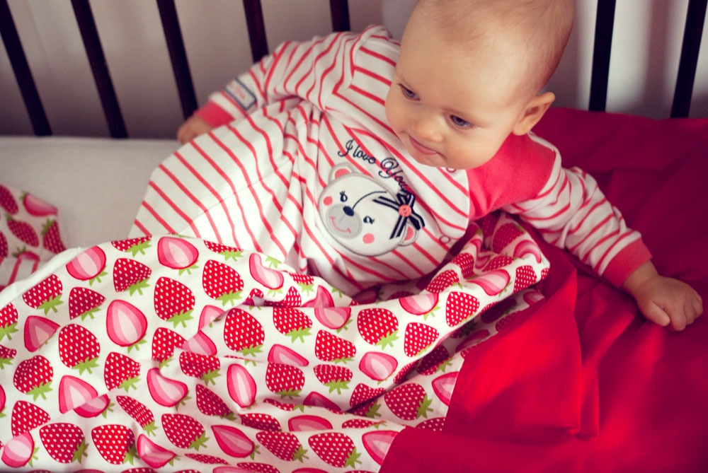Od urodzenia Lenki zastanawiałam się kiedy nadejdzie ten właściwi moment żeby mogła bezpiecznie spać na poduszce przykryta cieplutką kołderką. Czas leci, Lenka za kilka dni kończy dziewięć miesięcy a ja nadal nie znalazłam jednoznacznej odpowiedzi na pytanie czy ten moment już nadszedł. Opinie pediatrów są sprzeczne dlatego jeszcze przez jakiś czas nie zdecyduję się przykrywać małej kołderką w nocy, nadal śpi w śpiworku. Jest jej ciepło a ja mogę spać spokojnie. Ale przecież w dzień to zupełnie co innego dlatego przed dzisiejszą drzemką w łóżeczku czekała na nią truskawkowa niespodzianka.