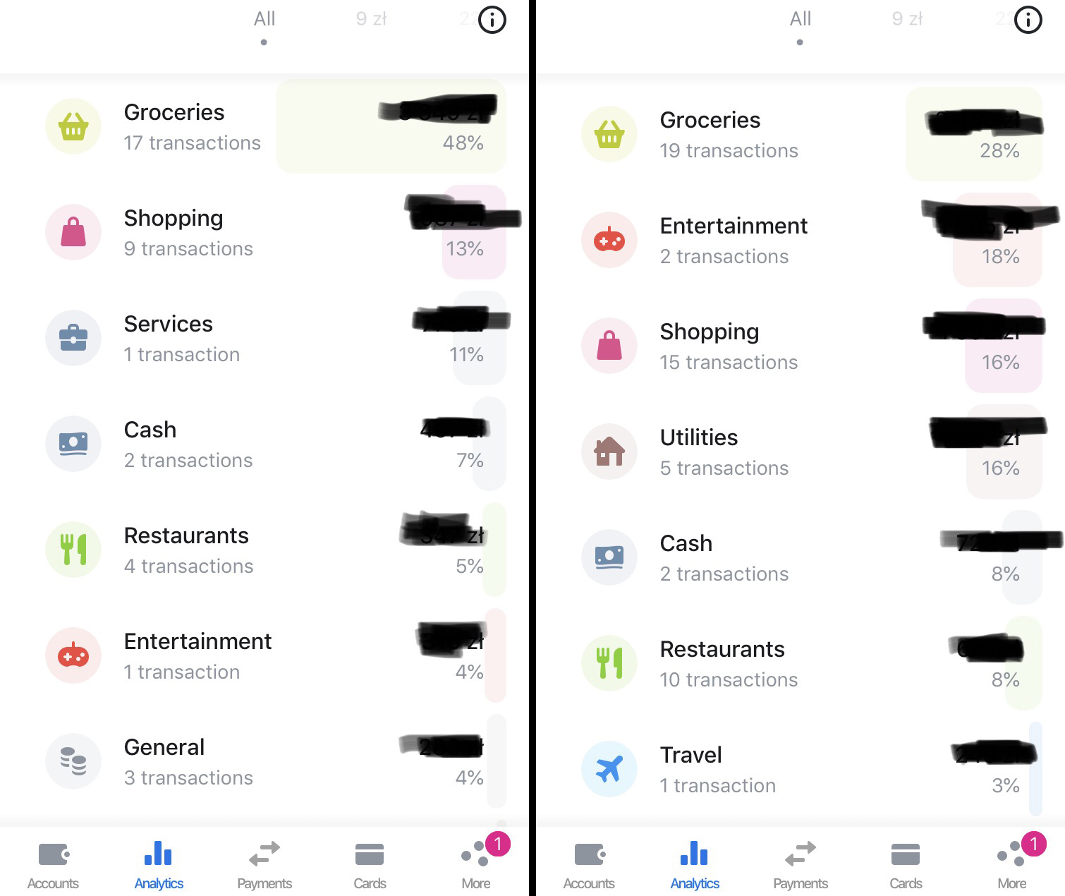 Ponieważ nasze wakacje zaczęliśmy w marcu, a skończyliśmy w kwietniu, screen po lewej stronie przedstawia wydatki z pierwszego miesiąca, prawy screen z drugiego miesiąca. W marcu prawie 50% naszych wydatków to zakupy w sklepach spożywczych… wygląda na to, że w kwietniu byliśmy już na diecie.