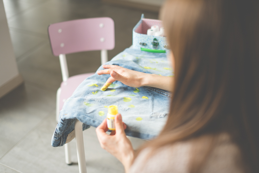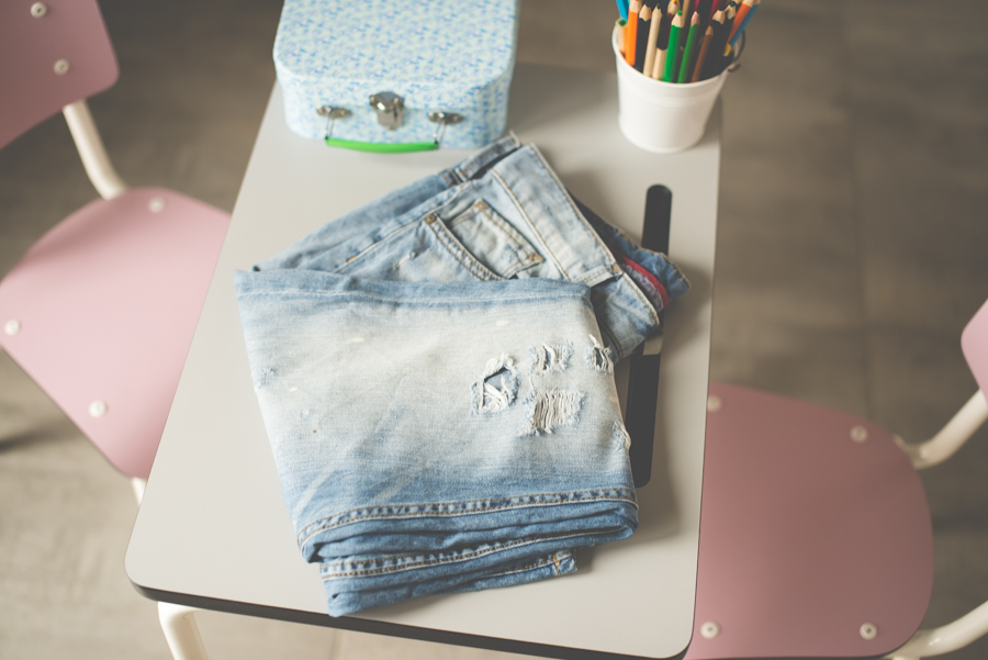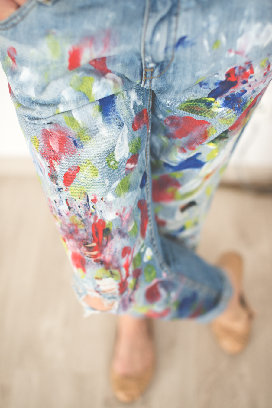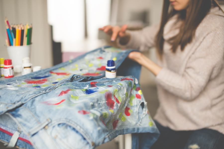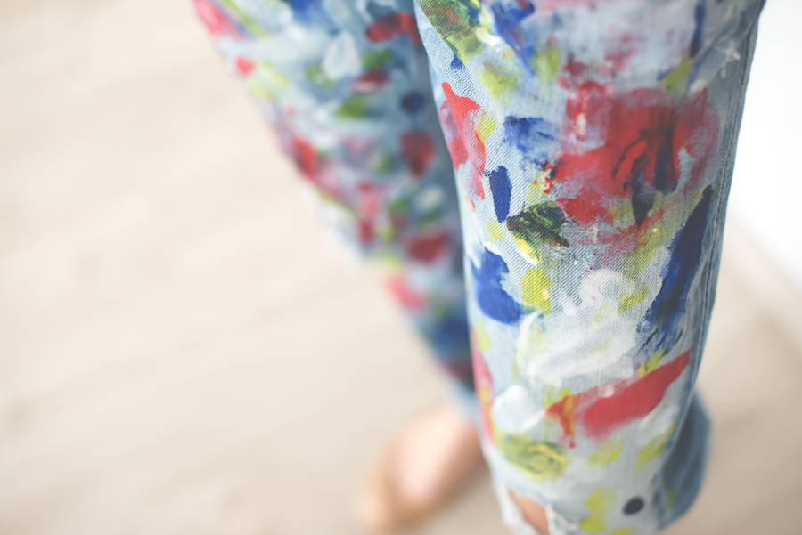 Ale taka zabawa to już co innego. W ostatnim czasie moją uwagę zwróciły zachlapane spodnie, które założyła Jessica Alba, bez wątpienia jedna z najlepiej ubranych mam show-biznesu. Niby nic szczególnego, a ta casualowa stylizacja aktorki zrobiła niezłe zamieszanie. Nie wiem jak Jessica, ale ja swoje spodnie wykonałam sama. Wykorzystałam do tego boyfriendy z dziurami kupione trzy lata temu na wyprzedaży w Mango i farby do tkanin z Empiku.