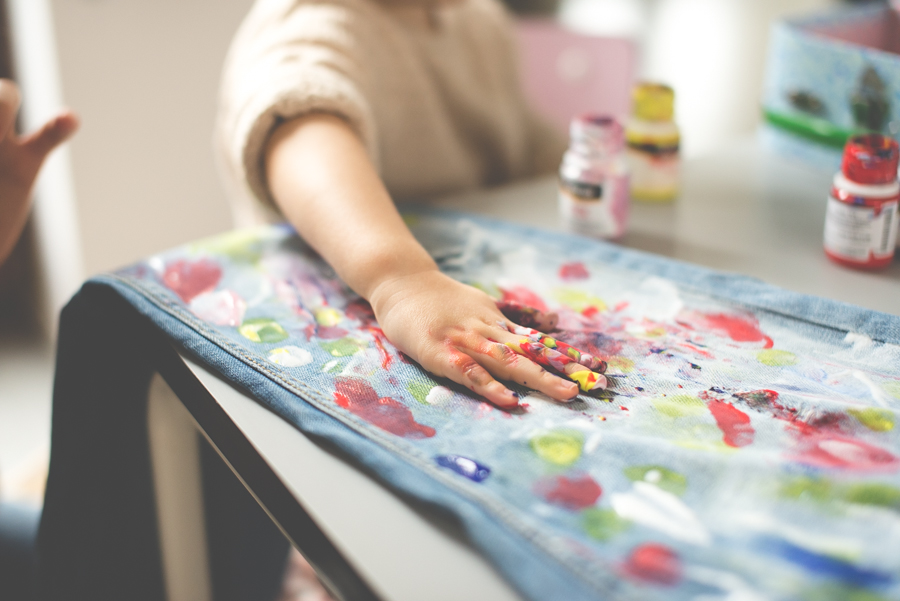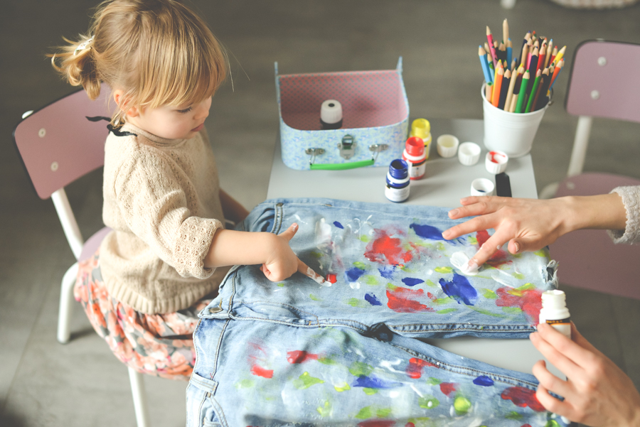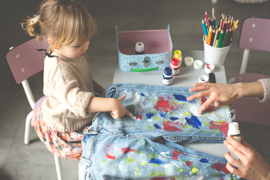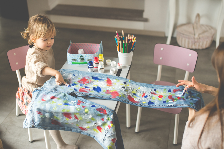 Spodnie malowałam oczywiście z Lenką. Chyba nie muszę nikogo przekonywać jaką frajdę ma dziecko, które może ubrudzić farbami spodnie mamy. Takie malowanie na głowę bije wszystkie zajęcia plastyczne.