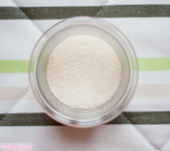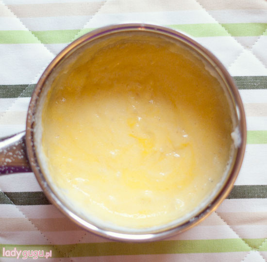 Zaczynamy od przygotowania 210 ml wody. Kaszę mannę gotujemy w 2/3 objętości wody, z pozostałej części wody przygotowujemy mleko. Gdy kaszka wystygnie mieszamy ją z mlekiem i dodajemy żółtko