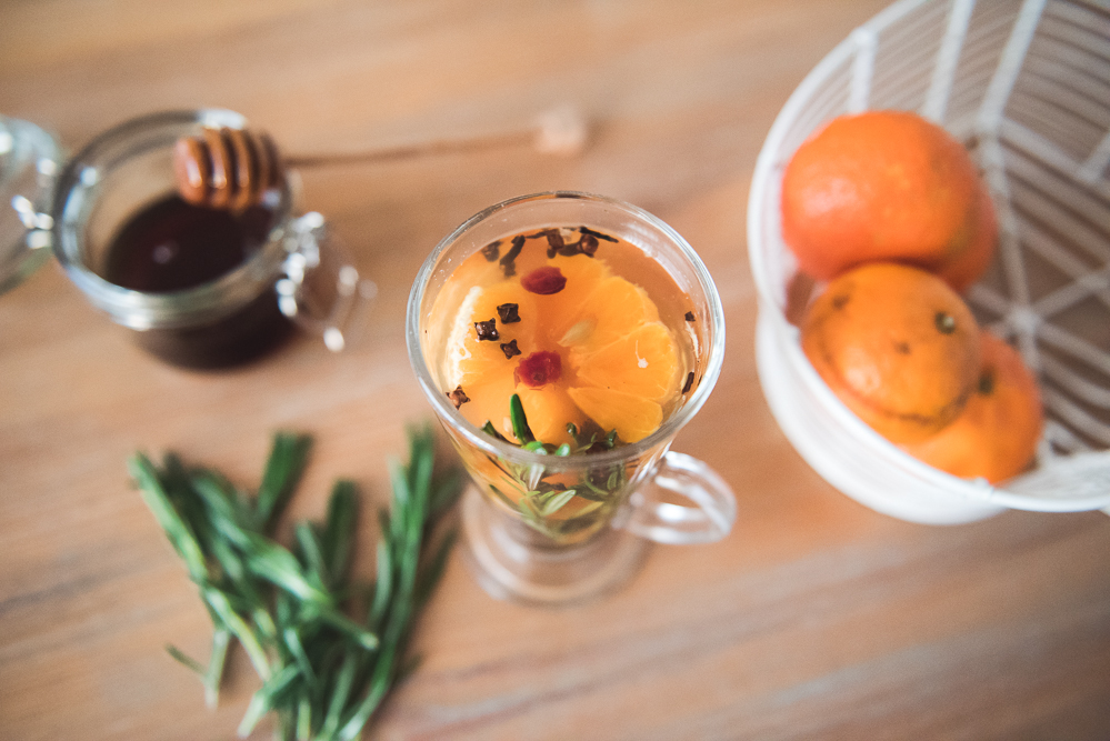Do szklanki wsypujemy herbatę, goździki, imbir pokrojony w kostkę i wszystko zalewamy wrzątkiem. Po kilku minutach dodajemy przekrojoną na pół mandarynkę, sok z cytryny i gałązki rozmarynu. Wszystko słodzimy miodem i gotowe!