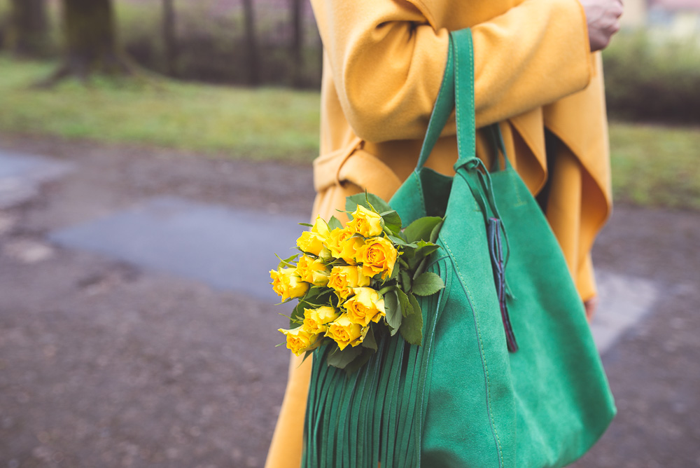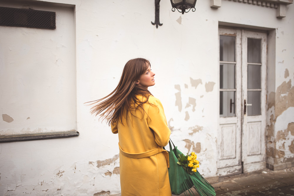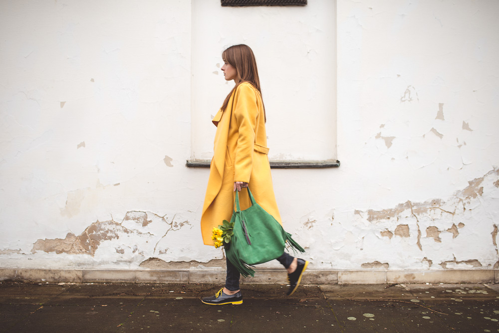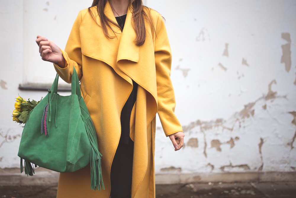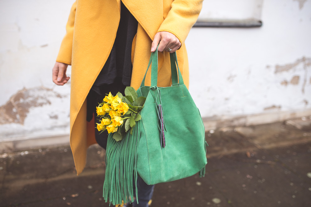 Zielona torebka od Zuzi Górskiej kazała mi na siebie długo czekać, ale warto było, bo z żółtym płaszczem tworzą mój ulubiony wiosenny zestaw, który najchętniej nosiłabym codziennie.